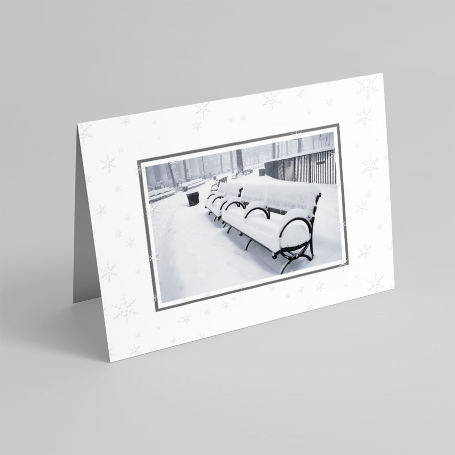 The joys of winter are a wonderful thing to share. An image of a park covered in snow prints on the front of this card with a white snowflake border. Find labels to use for your return address in our labels collection. Envelopes are included.