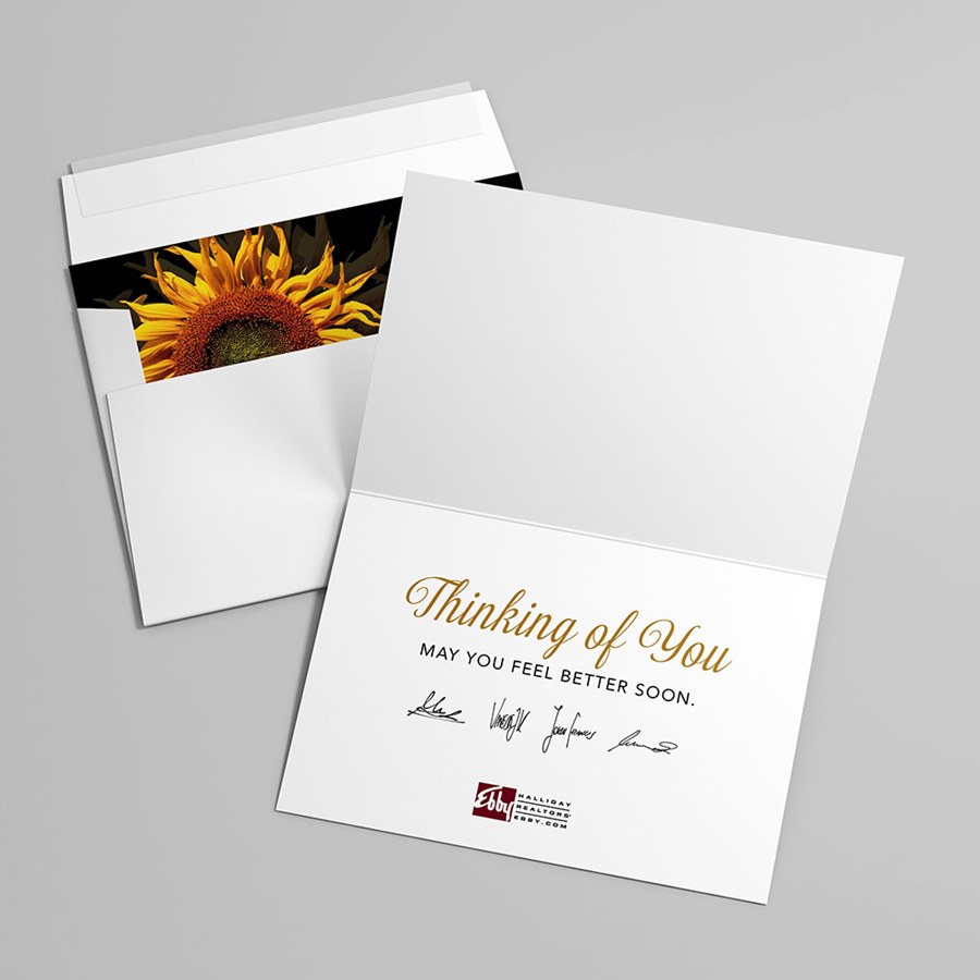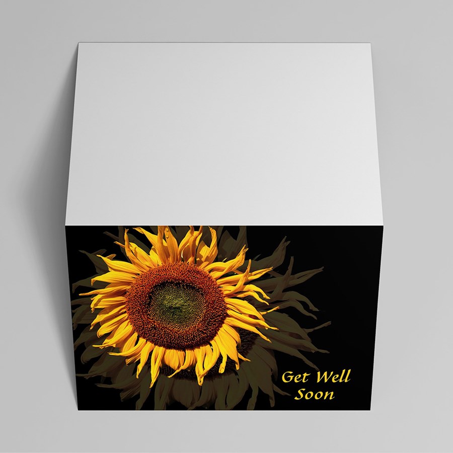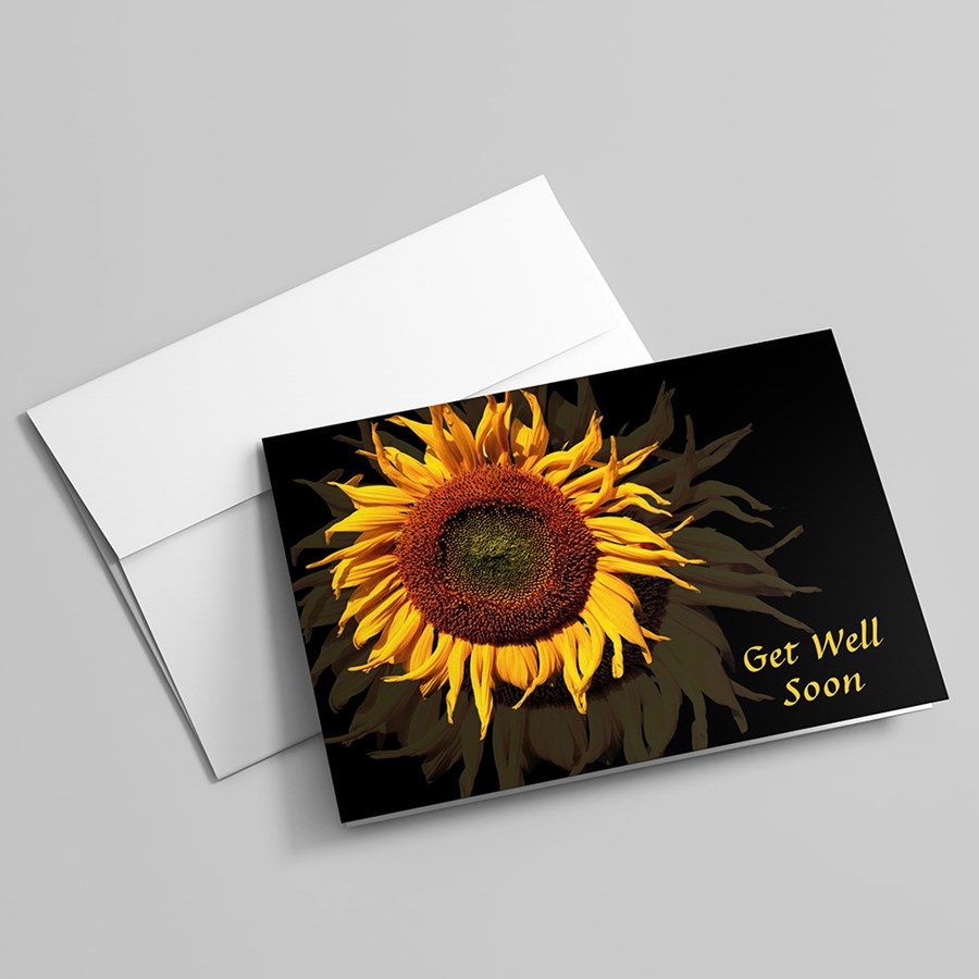 Cheer someone up with a nice get well card. A large sunflower is displayed on this get well card with a greeting in the lower corner. Your own message can be printed in your get well cards or you can use one of the greetings we've written.
