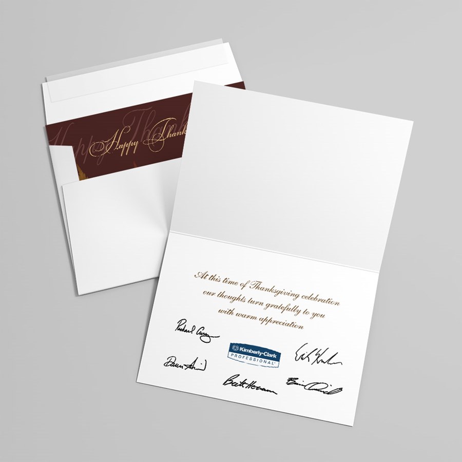 Say thank you to important relationships with a classic Thanksgiving card. The card has a brown background that shows two leaf graphics and a cursive Thanksgiving message. Envelopes will come with your order.