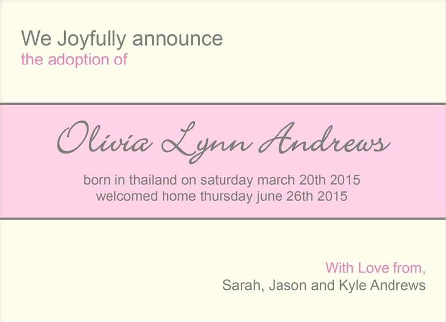 Cream and pink birth announcements like this one are simple and beautiful. The cursive font on this announcement will show your newborn's name in a lovely way. Order baby thank you cards too so you can thank people with a personalized card.