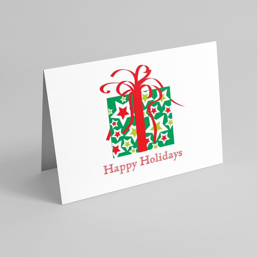 Giving warm wishes to employees, clients, friends, and family is a gift. This card prints with an image of a gift box wrapped and topped with a bow. Change the inside of your Red and Green Gift holiday cards with a note, logo, and digital signature.
