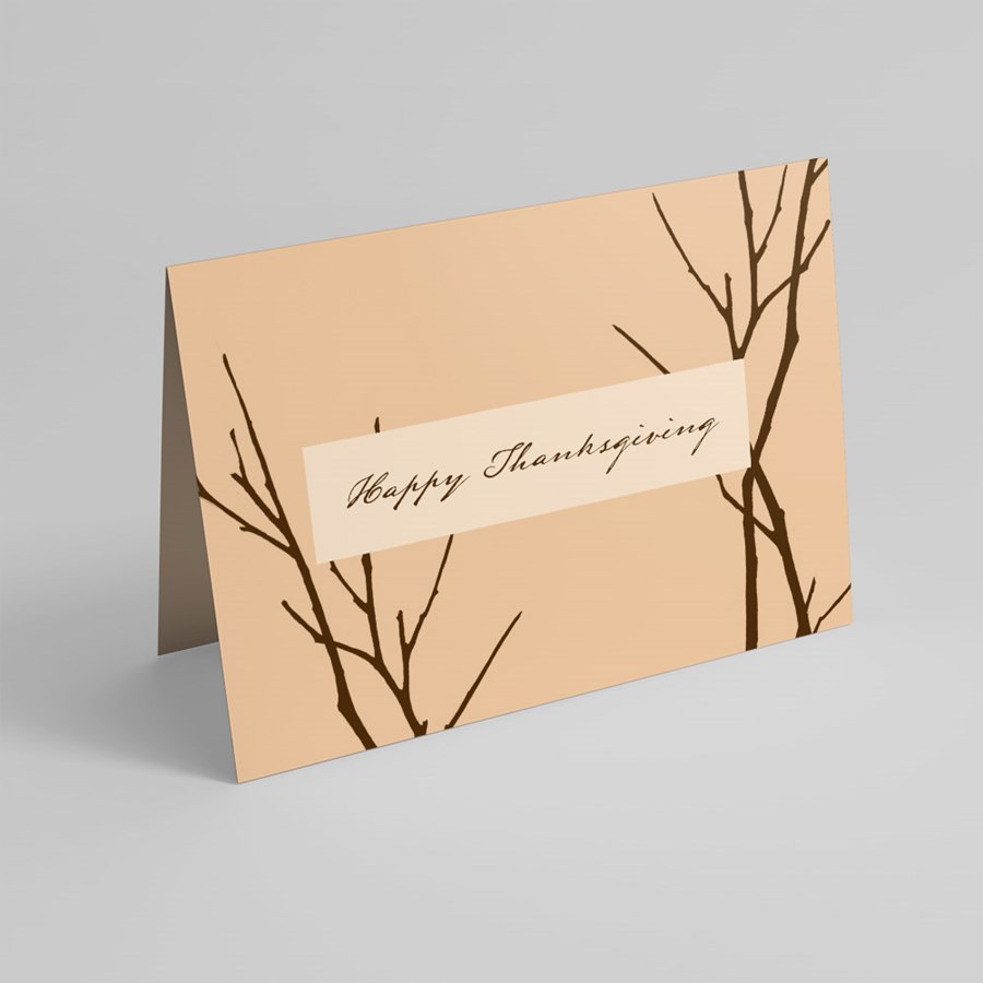 Thanksgiving cards are a simple way to strengthen your business and personal relationships. This card has a light brown background and tree branch graphics that remind us of fall. These cards come with envelopes.