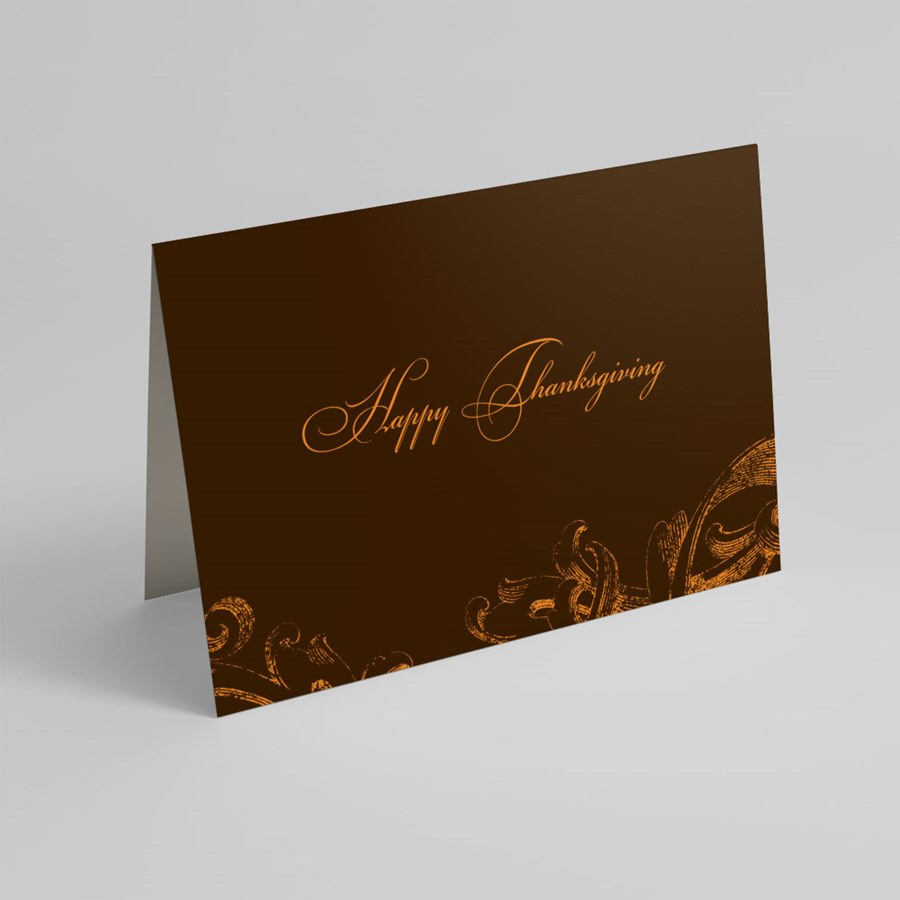 This is the time of the year to express thanks to all those important people in your life or business. This card has a brown background and bottom border graphic design with "Happy Thanksgiving" front and center.