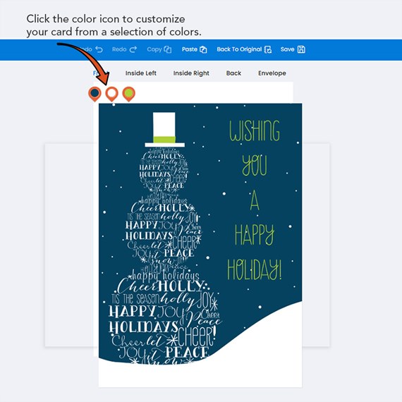 Holiday cards help you share a beautiful holiday. The card has a snowman designed out of holiday phrases with a winter background. Snowman Design cards come with envelopes free of charge.