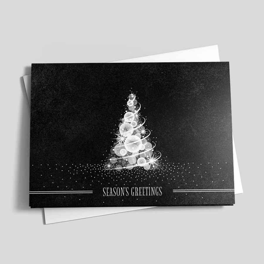 The design on this card is sophisticated and fascinating. A black background highlights a bright white tree of ornaments with shining stars that decorate the inside of the card too. Shining Black and White holiday cards come with envelopes.