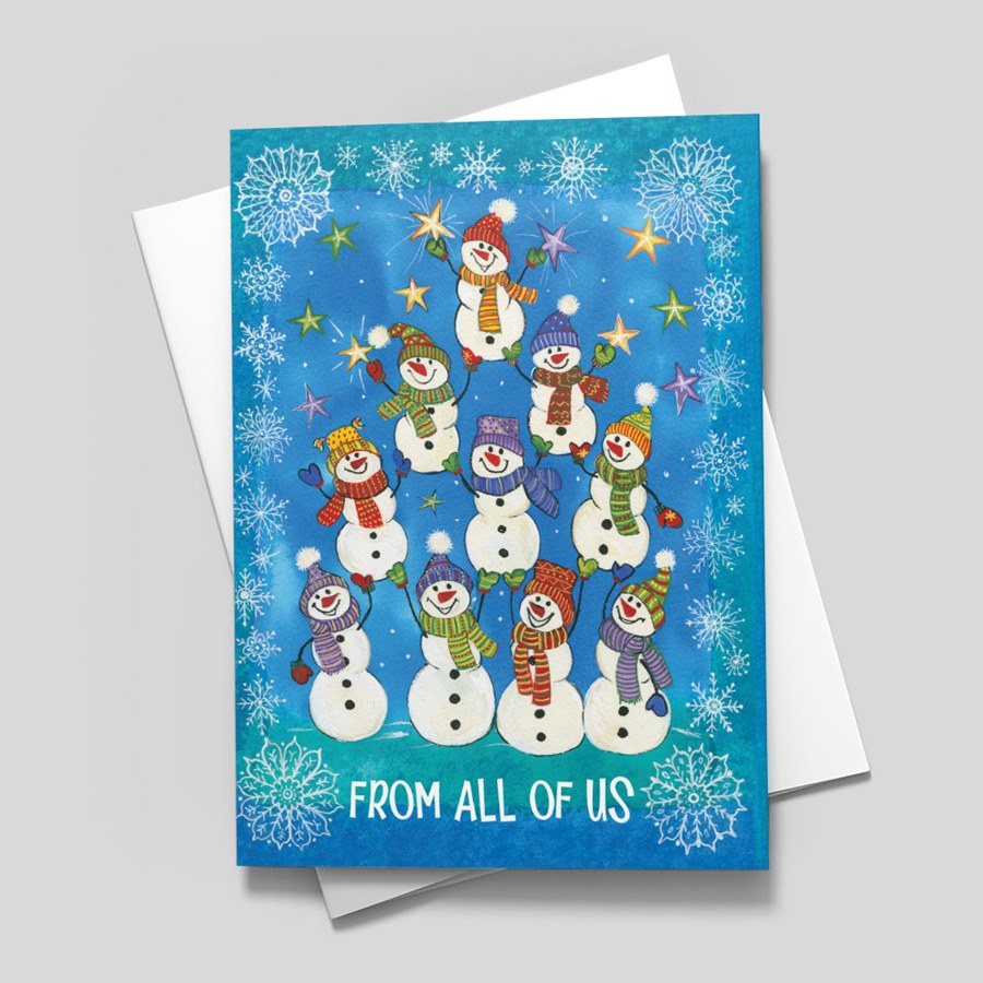 Spread the fun of the holidays with this great card. The card shows a stack of numerous snowmen holding stars. The card has a snowflake border and a blue background. Envelopes come with your order.