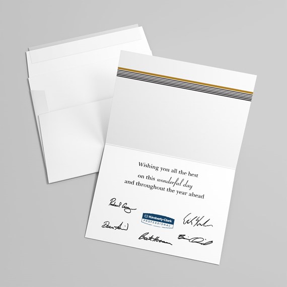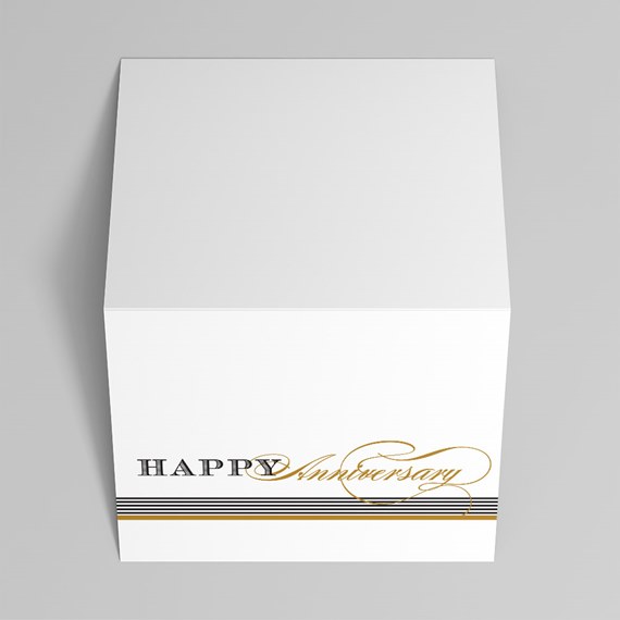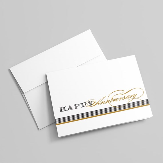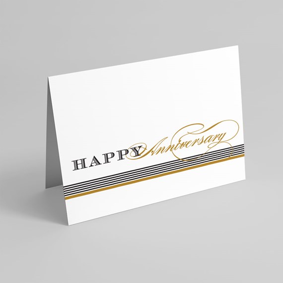 A simple white card is pinstriped with black and gold to highlight your words of Happy Anniversary in matching colors. Mark their special day with a personalized card that will surely be remembered by all those that receive it.