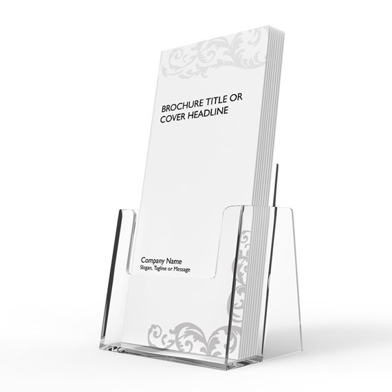 This classically elegant Flirty Swirl brochure showcases a black and gray swirly damask pattern. The black and gray design image continues on both the outside and inside panels of the brochure. These 11" x 8.5" Tri-fold brochures are a great way to showcase all of your company's services in one handy pamphlet. The two sided printing gives you enough room to tell potential clients about your competitive advantages. Use this 100# white glossy stock to make your photos really pop or use the 80# Natural White Linen stock for a more polished and professional look. In our studio, the front side is the inside of your brochure. The back side folds left side in and then right side in so the front of your brochure is the third panel on the back plate and the back of your brochure is the middle panel of the back plate. Your brochures will come pre-folded for you to be ready to hand out. We also include a free acrylic holder stand to keep them visible and easily accessible for potentially new clients.