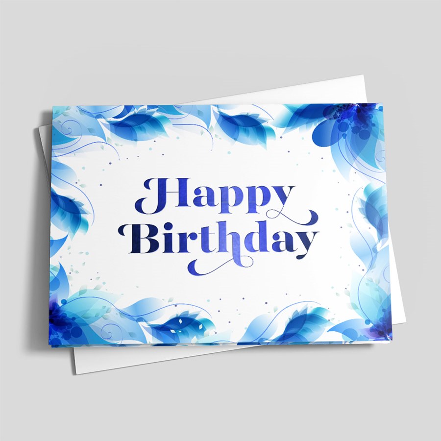 Blue flowers border the front of this card, as well as the edges of the interior. The back of the card is solid blue. The front features the words ‘Happy Birthday’ in blue foil. Ample white space is provided inside to include a custom message, your digital signature, and company logo.