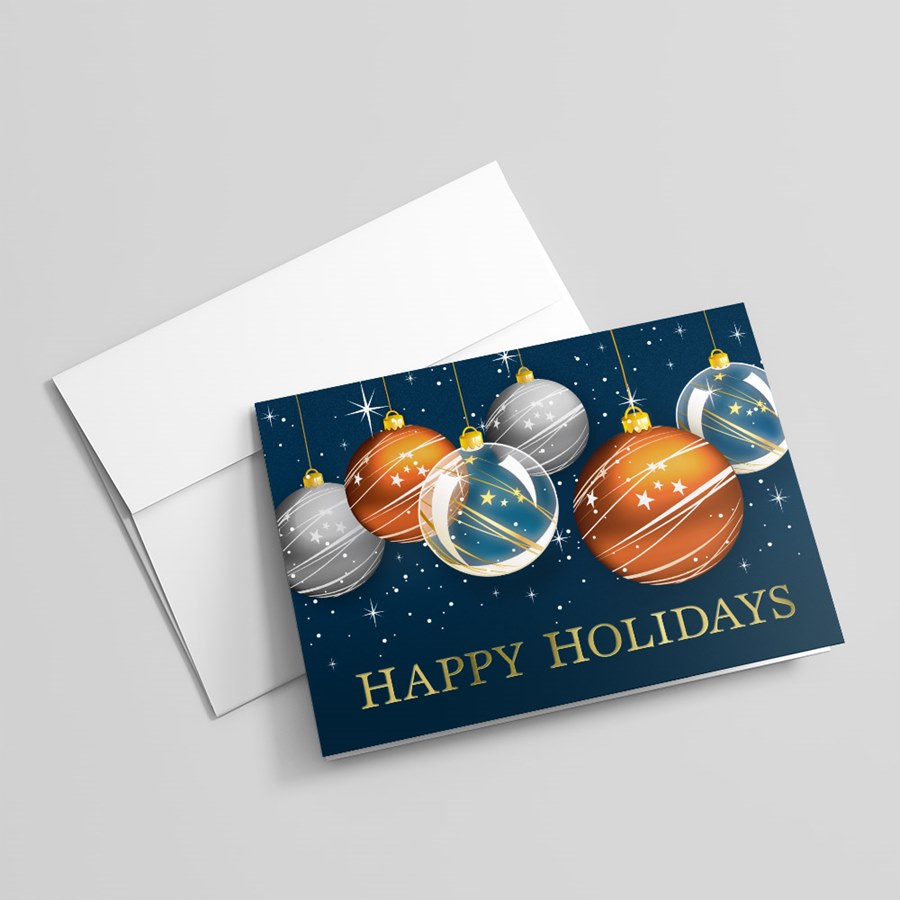 ‘Happy Holidays’ is written in gold foil letters underneath a sparkling arrangement of silver, copper, and clear ornaments with gold and white accents. The background on both sides of the card is a starlit midnight blue, and a solid white interior offers the ideal space for a custom message, your digital signature, and company logo.