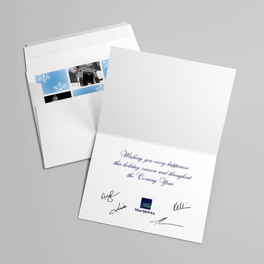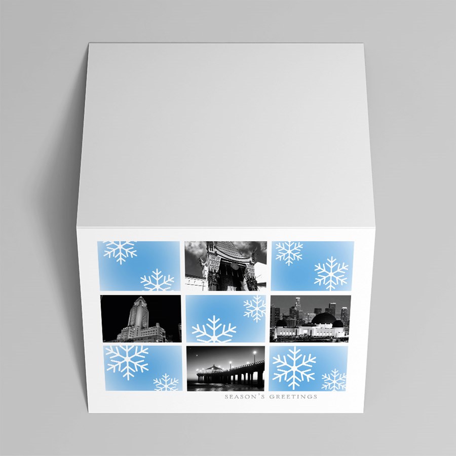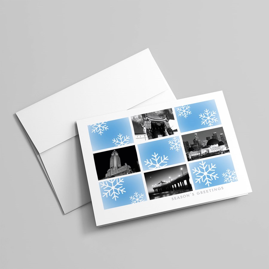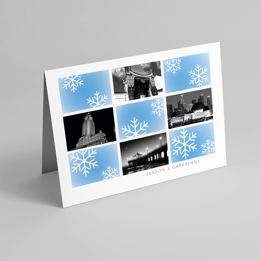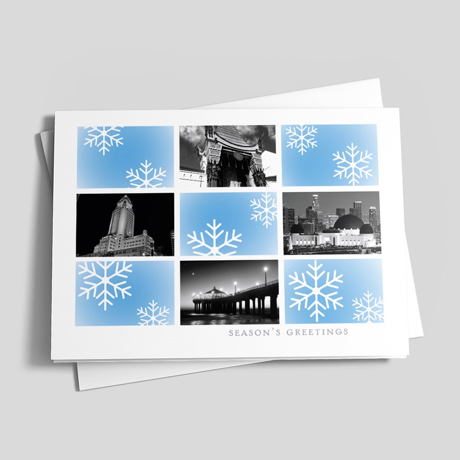The most recognizable landmarks of Los Angeles are captured in squares of black and white photography and surrounded by white snowflakes on this striking holiday greeting. Season's Greetings appears below the boxes on the front of this white greeting card to send your best from the City of Angels.