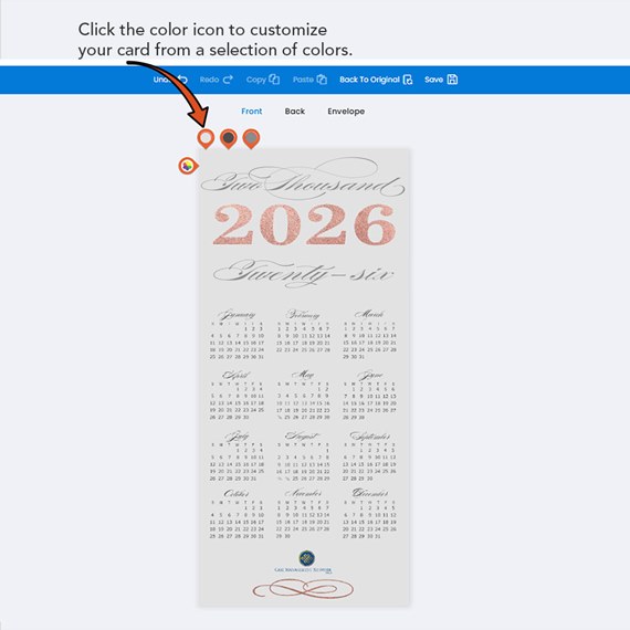 Brushed silver hues create the background for this stylish calendar. Rose gold foil showcases the year in numbers, and a silver script presents the date in letters. At the bottom, lies an elegant gold foil accent with space right above it to add your personal information. The days and months are included on the calendar in silver.