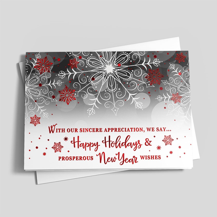 Intricate red and white snowflakes and polka dots, small white stars, and a bokeh pattern create a lively design on this gray and white card. The message reads 'With Our Sincere Appreciation, We Say...Happy Holidays & Prosperous New Year Wishes' in red foil with graphical accents like the ones above, but in red foil. The interior is bordered with the same design elements as the front.