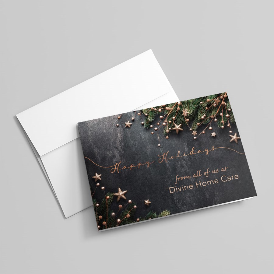 This holiday card features a stylish black and gray background on the front and back. The front includes gold stars, twigs, and ornaments, as well as green pine sprigs. The message reads 'Happy Holidays' in rose gold foil. Add your customizations.