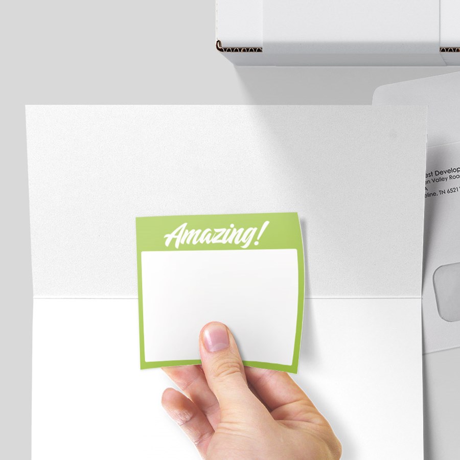 High-quality 3” x 2-7/8" Post-it® Notes with a white background, lime green border, and a message of 'Amazing!' at the top in a stylish white font. 50 sheets per pad.