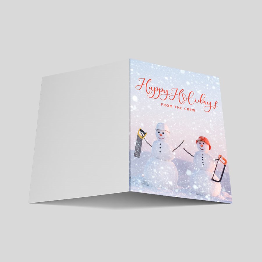 Two snowmen wearing hardhats (one white and one orange) and carrying saws (one with a yellow handle and one with an orange handle) stand under a message of 'Happy Holidays From The Crew' in stylish red-orange text on this construction-themed holiday card. Choose from different paper types, sizes, and envelopes, then add your personalization.