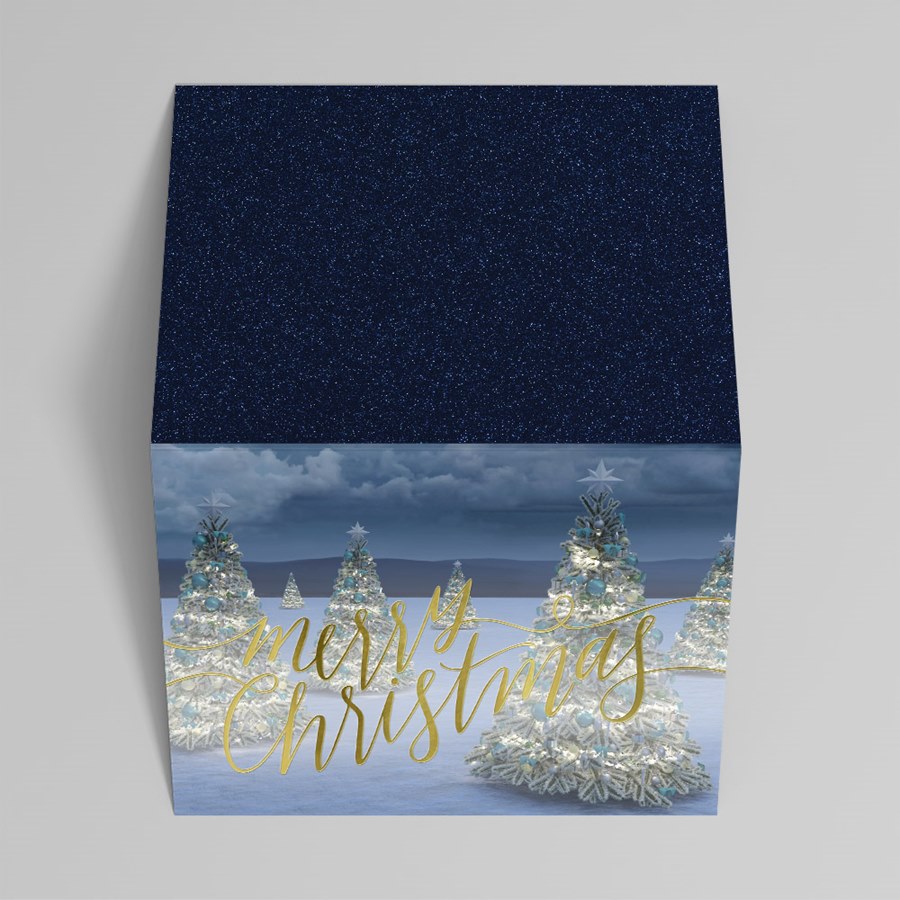 This custom Christmas card features green, white, and teal Christmas trees shown across a vast wintry landscape. A stylish foil script displays a Merry Christmas message that you can change to any color you like, such as gold, silver, rose gold, copper, red, green, or blue. The interior of the card is white, and the back is midnight blue with a subtle star pattern. Choose from different paper types and envelopes, then add your personalization, including text, graphics, photos, logos, signatures, and more. Select from pre-crafted messages, or create your own! Want to have your cards mailed for you? Select Addressing + US Stamp + Mail at checkout.