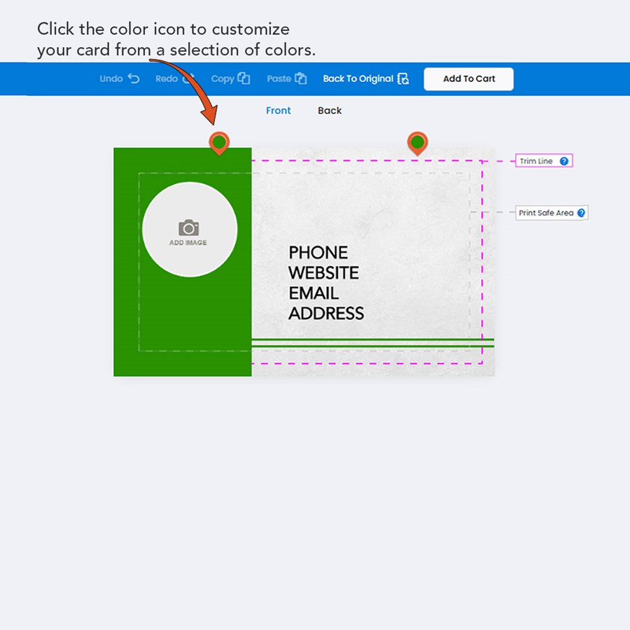 This custom business card features a color block on the left side with two accent lines at the bottom and a circle graphic where you can add a photo or logo. Add your essential business information, and choose single or double-sided printing for more space. Select from various paper types and styles.