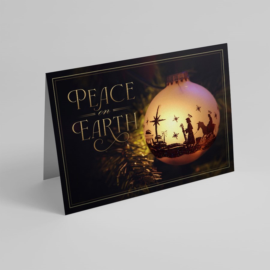 This custom religious Christmas card features a single ornament nestled in a Christmas tree. A soft white light displays the silhouette of the wise men's journey to Bethlehem. A 'Peace on Earth' message is shown in stylish gold letters. The card's interior is white, and the back is black. Add your free customization, including a name or company name, message, photo, logo, signatures, and more! Choose from different sizes, paper types, and envelopes with gummed or sanitary peel-and-seal closures. Want to have your personalized cards mailed to your recipients for you? Click 'Addressing + US Stamp + Mail' under the 'Addressing' tab when making your selections.