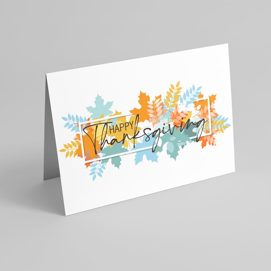 This custom Thanksgiving card features a modern, colorful autumn leaf design on a white background, accenting the words 'Happy Thanksgiving' in stylish black text. The card's interior is white, and the back is weathered gold. Add your free customization, including a name or company name, message, photo, logo, signatures, and more! Choose from different sizes, paper types, and envelopes with gummed or sanitary peel-and-seal closures. Want to have your personalized cards mailed to your recipients for you? Click 'Addressing + US Stamp + Mail' under the 'Addressing' tab when making your selections.