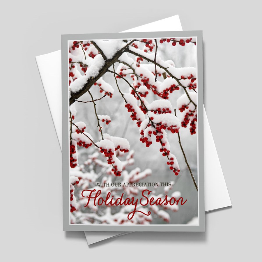 This custom holiday card features a snow-covered tree with red berries. In stylish black and red text, the message reads, 'With Our Appreciation This Holiday Season.' Add your free customization, including a name or company name, message, photo, logo, signatures, and more! Choose from different sizes, paper types, and envelopes with gummed or sanitary peel and seal closures. Want to have your personalized cards mailed to your recipients for you? Click 'Addressing + US Stamp + Mail' under the 'Addressing' tab when making your selections.