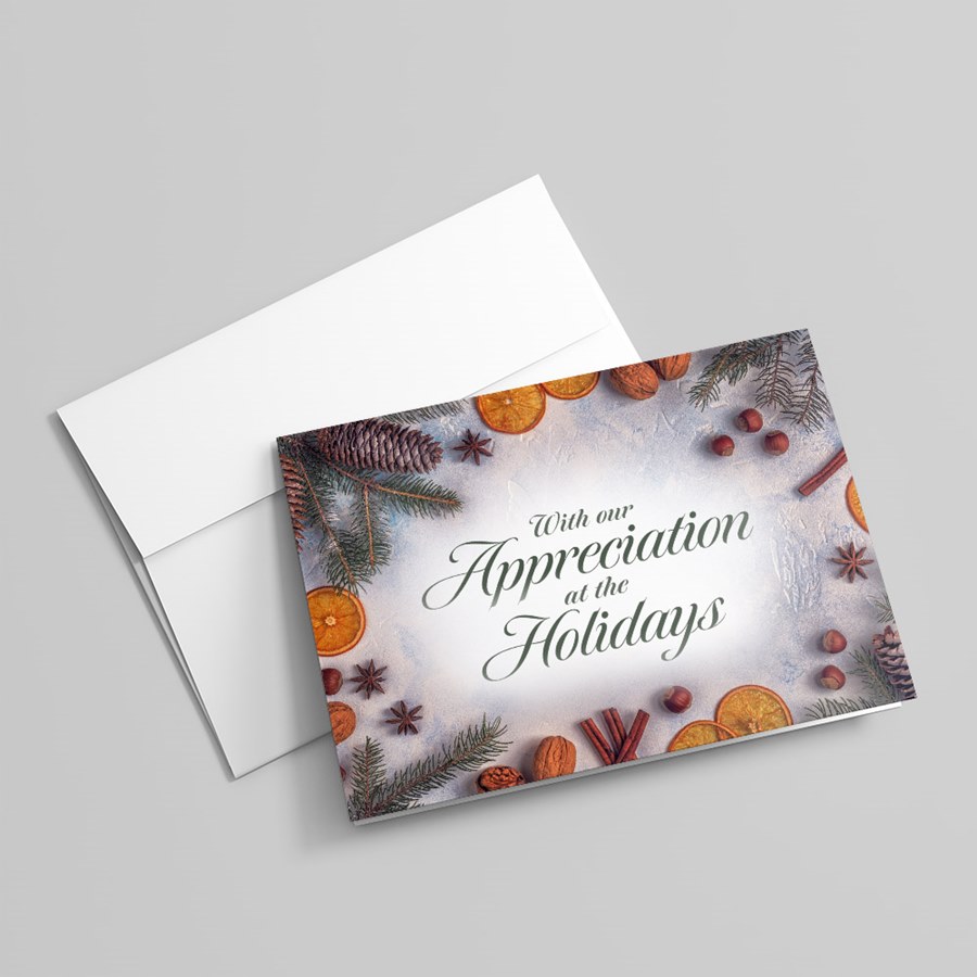 This custom holiday card features a border made of pine sprigs, pinecones, star anise, cinnamon sticks, nuts, and dried orange slices on an icy background around a message that reads, 'With our Appreciation at the Holidays' in a stylish green script. The back of the card continues the design on the front with additional seasonal accents on an icy background. Add your free customization, including a name or company name, message, photo, logo, signatures, and more! Choose from different sizes, paper types, and envelopes with gummed or sanitary peel-and-seal closures. Want to have your personalized cards mailed to your recipients for you? Click 'Addressing + US Stamp + Mail' under the 'Addressing' tab when making your selections.