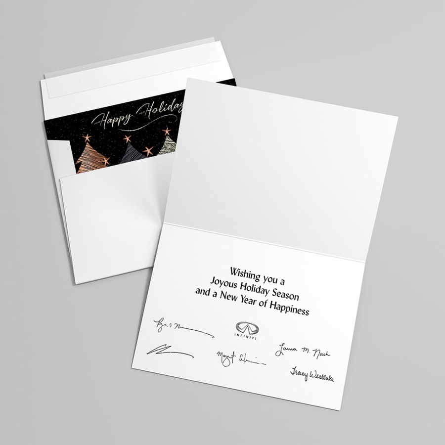 This custom holiday card features Christmas tree sketches in gold, white, and purple-gray underneath a Happy Holidays message in a stylish white script. The card's interior is white, and the back is black. Add your free personalization, including a name or company name, message, photo, logo, signatures, and more! Choose from different sizes, paper types, and envelopes with gummed or sanitary peel-and-seal closures. Want to have your cards mailed to your recipients for you? Click 'Addressing + US Stamp + Mail' under the 'Addressing' tab when making your selections.