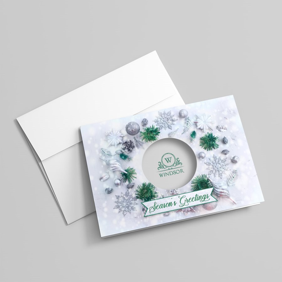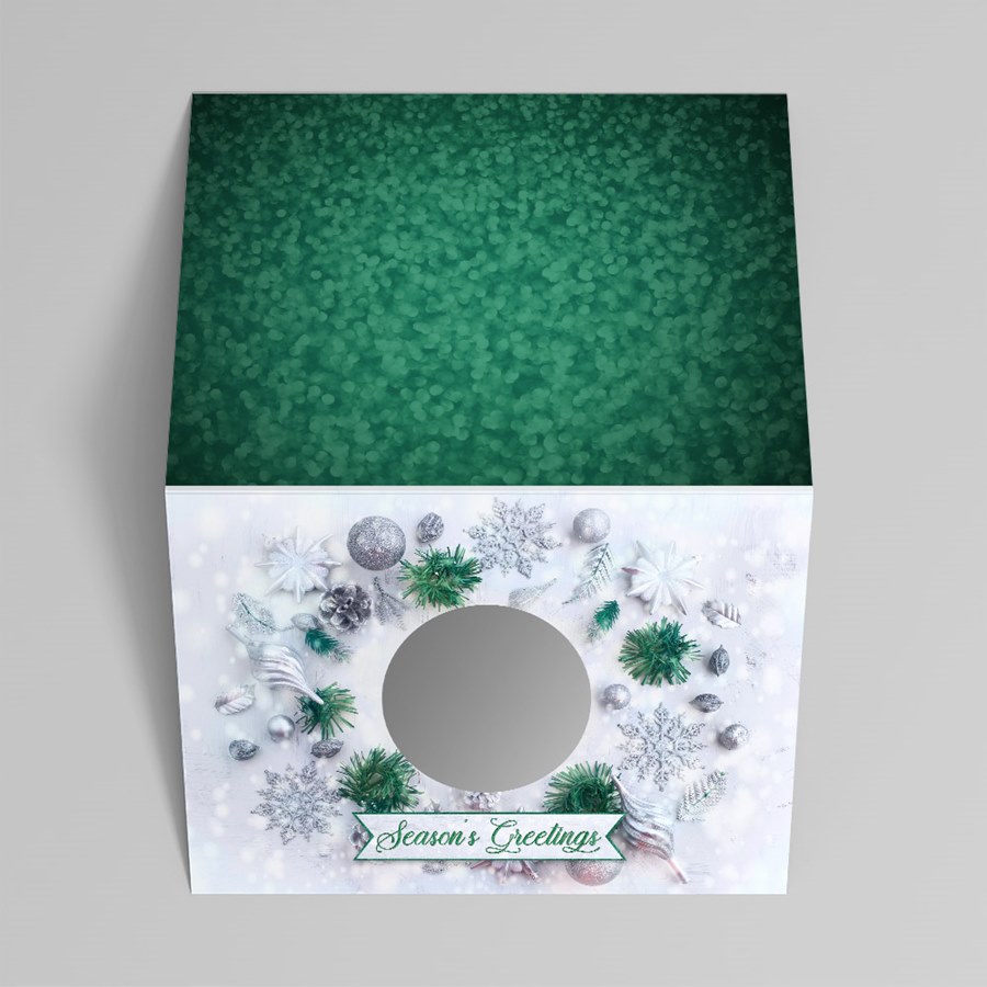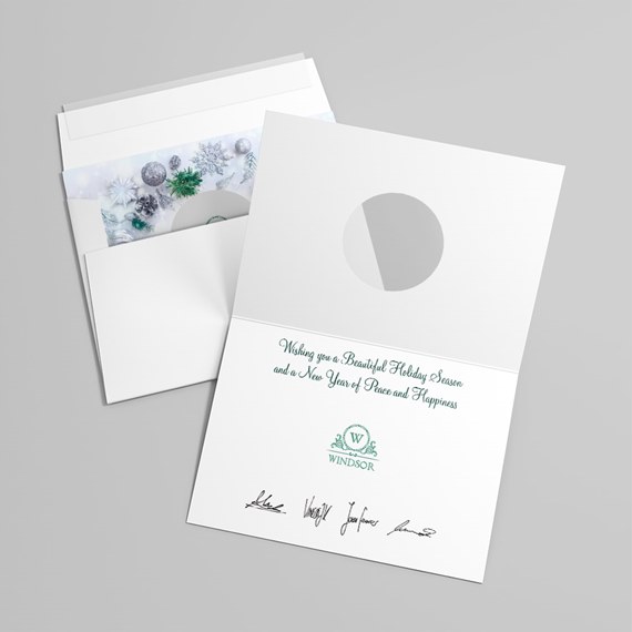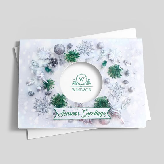 This festive die-cut custom holiday card will prominently display a name, company name, logo, or short personalized message on the front inside a circular die-cut in the center. This card design eatures a snowy background with green pine, silver ornaments and snowflakes. A 'Season's Greetings' message is displayed at the bottom on a small banner with a green border in a stylish green script. The card's interior is white, and the back is dotted green. Add your free customization, including a name or company name, message, photo, logo, signatures, and more! Choose from different sizes, paper types, and envelopes with gummed or sanitary peel-and-seal closures. Want to have your personalized cards mailed to your recipients for you? Click 'Addressing + US Stamp + Mail' under the 'Addressing' tab when making your selections.