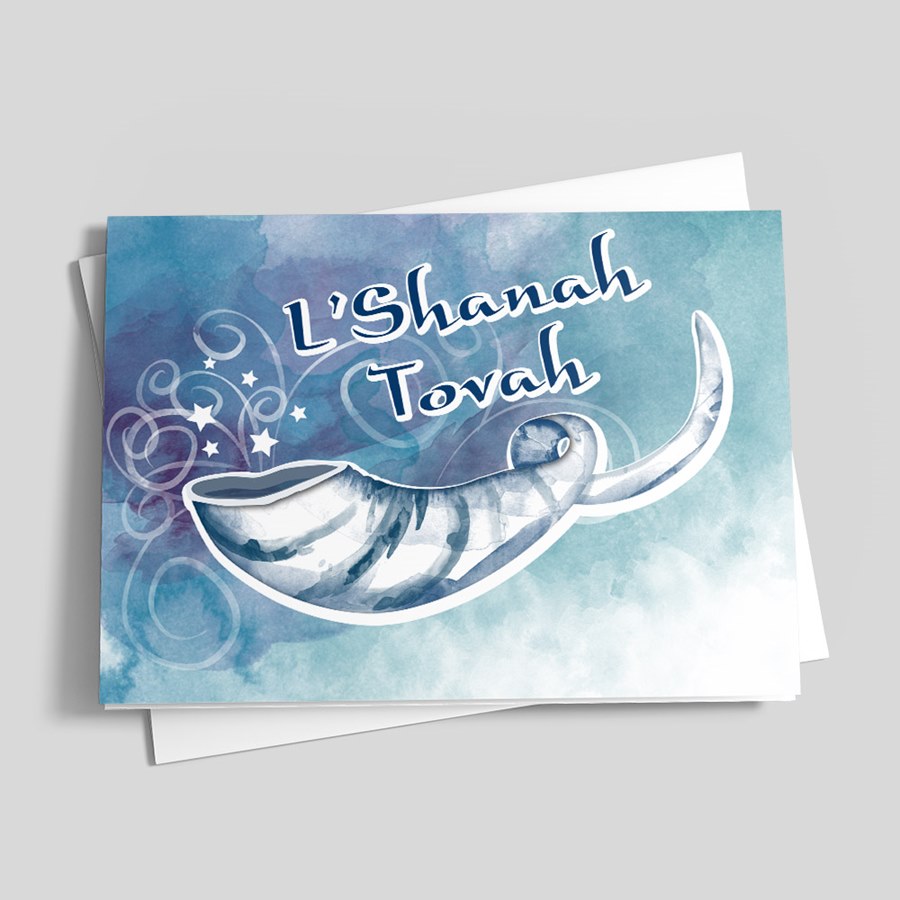 This custom Rosh Hashanah card features a L'Shanah Tova message in a stylish blue and white script on a blue and green watercolor background with stars, swirls, and a shofar. Add your free customization, including a name or company name, message, photo, logo, signatures, and more! Choose from different sizes, paper types, and envelopes with gummed or sanitary peel-and-seal closures. Want to have your personalized cards mailed to your recipients for you? Click 'Addressing + US Stamp + Mail' under the 'Addressing' tab when making your selections.