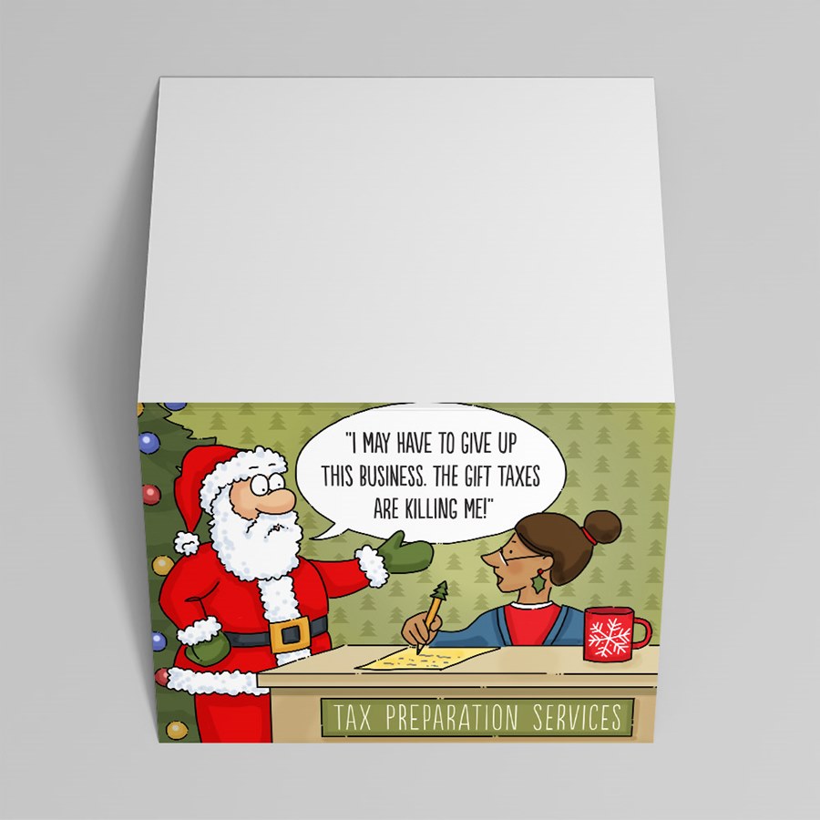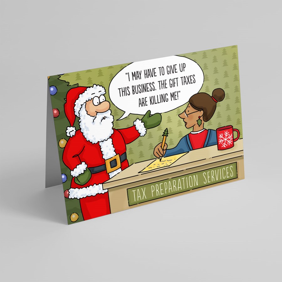This financial-themed holiday card features Santa having a discussion with his accountant with a quote that reads, "I may have to give up the business. The gift taxes are killing me!" Add your free customization, including a name or company name, message, photo, logo, signatures, and more! Choose from different sizes, paper types, and envelopes with gummed or sanitary peel and seal closures. Want to have your personalized cards mailed to your recipients for you? Click 'Addressing + US Stamp + Mail' under the 'Addressing' tab when making your selections.