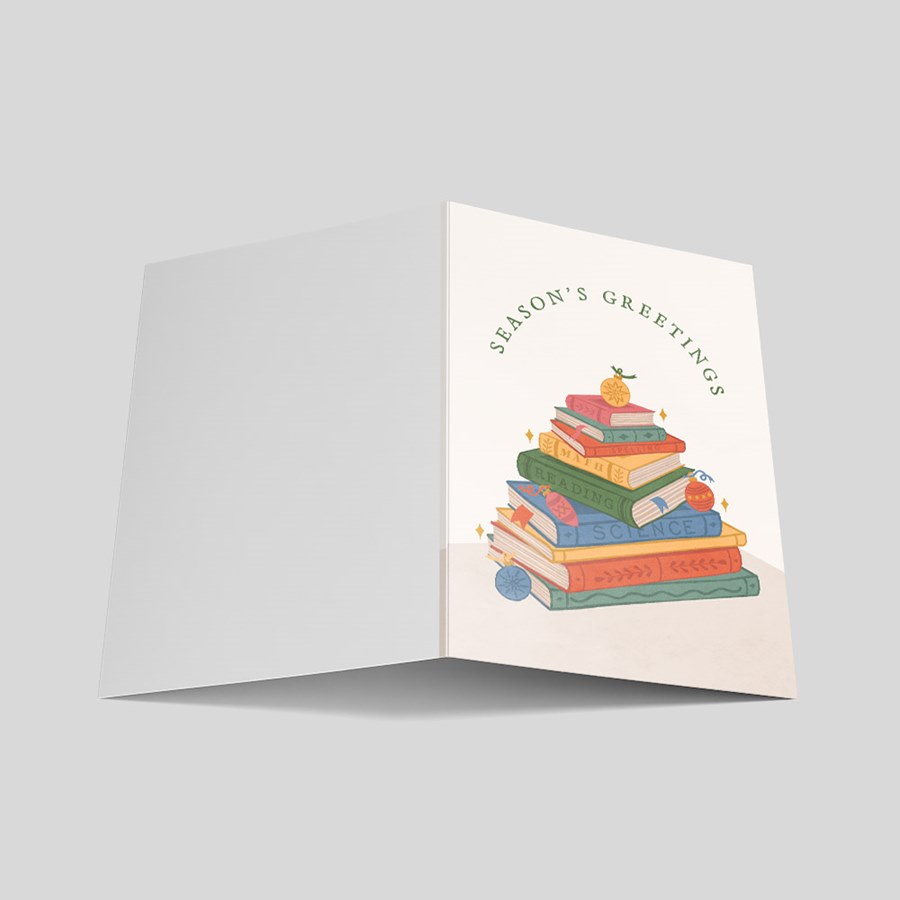 This education-themed holiday card features a colorful pile of textbooks and Christmas ornaments on a beige background underneath a Season's Greetings message in stylish green text. Add your free customization, including a name or company name, message, photo, logo, signatures, and more! Choose from different sizes, paper types, and envelopes with gummed or sanitary peel and seal closures. Want to have your personalized cards mailed to your recipients for you? Click 'Addressing + US Stamp + Mail' under the 'Addressing' tab when making your selections.