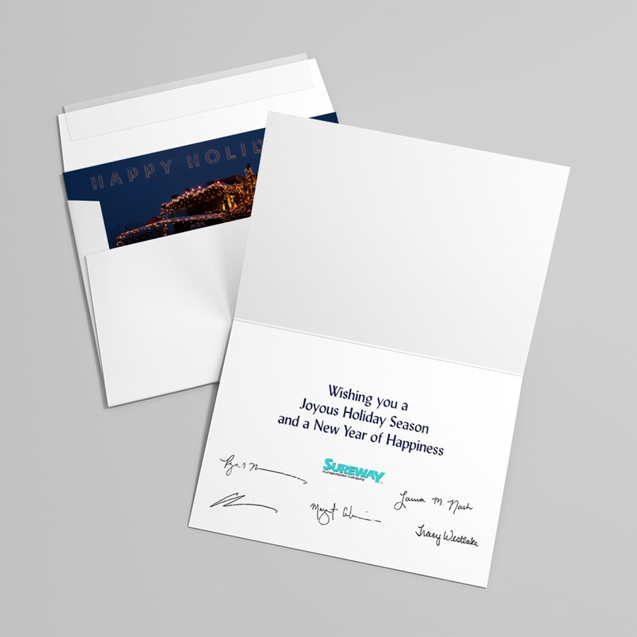 This trucking-themed holiday card features a semi truck adorned in Christmas lights underneath a Happy Holidays message in stylish gold letters. The card's interior is white, and the back is black. Add your free customization, like a name or company name, message, photo, logo, signatures, and more! Choose from different sizes, paper types, and envelopes with gummed or sanitary peel-and-seal closures. Want to have your personalized cards mailed to your recipients for you? Click 'Addressing + US Stamp + Mail' under the 'Addressing' tab when making your selections.