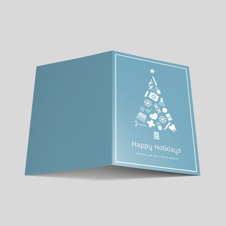 This custom holiday card features various medical icons forming a Christmas tree. The card includes a blue-gray background on the front and back. The design on the front is shown in white and blue-gray above a Happy Holidays message in stylish white text. Add your free customization, like a name or company name, message, photo, logo, signatures, and more! Choose from different sizes, paper types, and envelopes with gummed or sanitary peel-and-seal closures. Want to have your personalized cards mailed to your recipients for you? Click 'Addressing + US Stamp + Mail' under the 'Addressing' tab when making your selections.