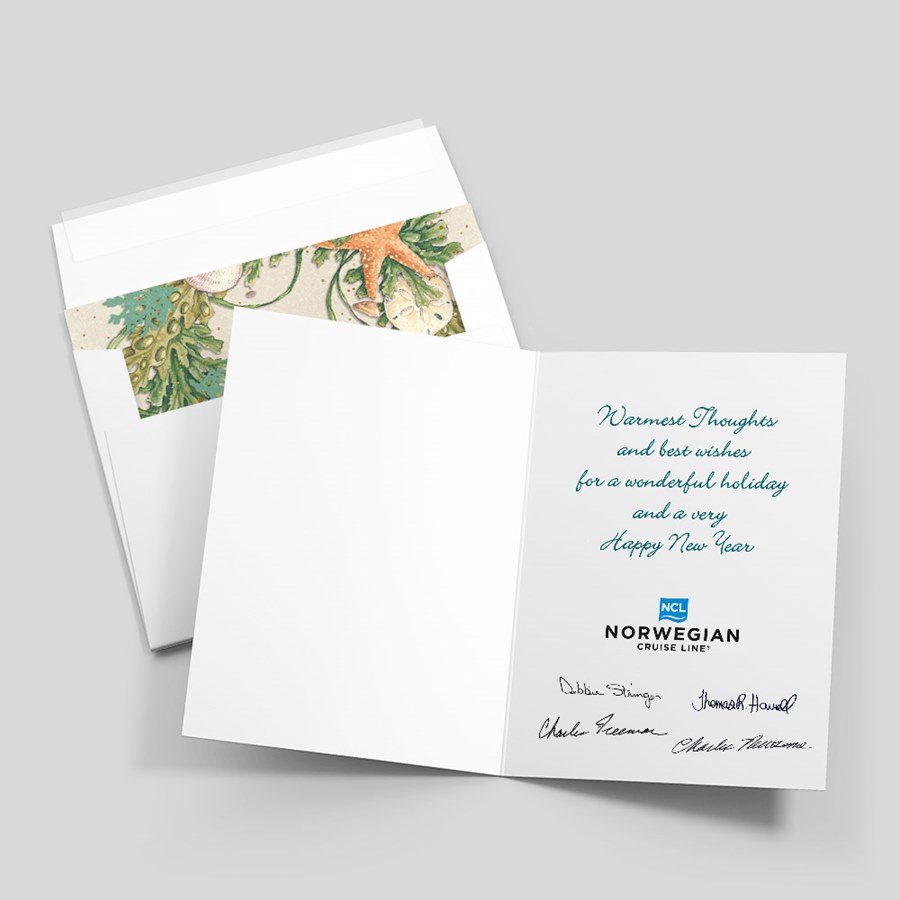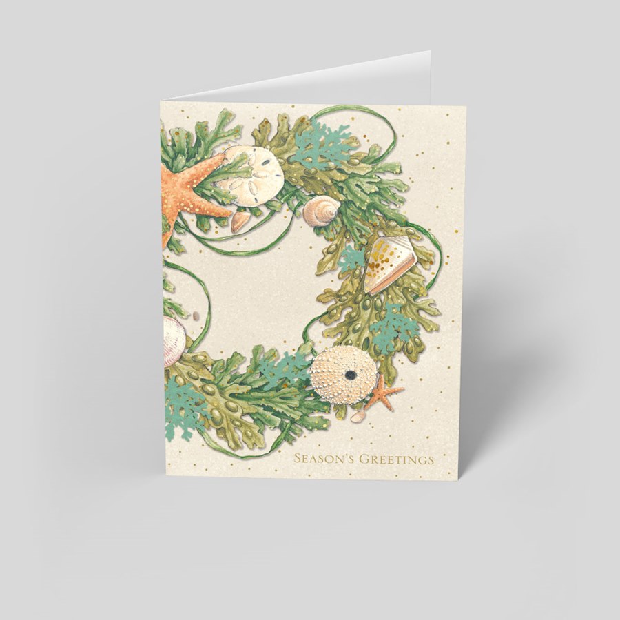 This tropical-themed custom holiday card features a beige paper with gold speckling and a wreath made of shells, starfish, sanddollars, and seaweed with a gold Season's Greetings message at the bottom. Add your free personalization.