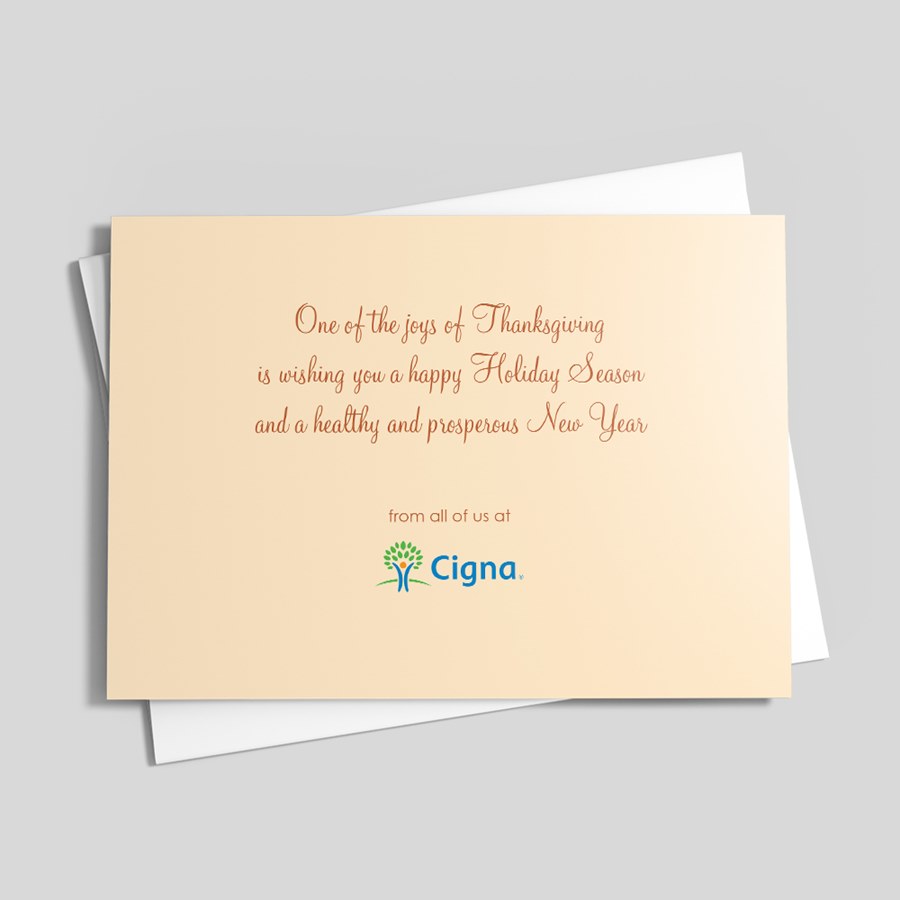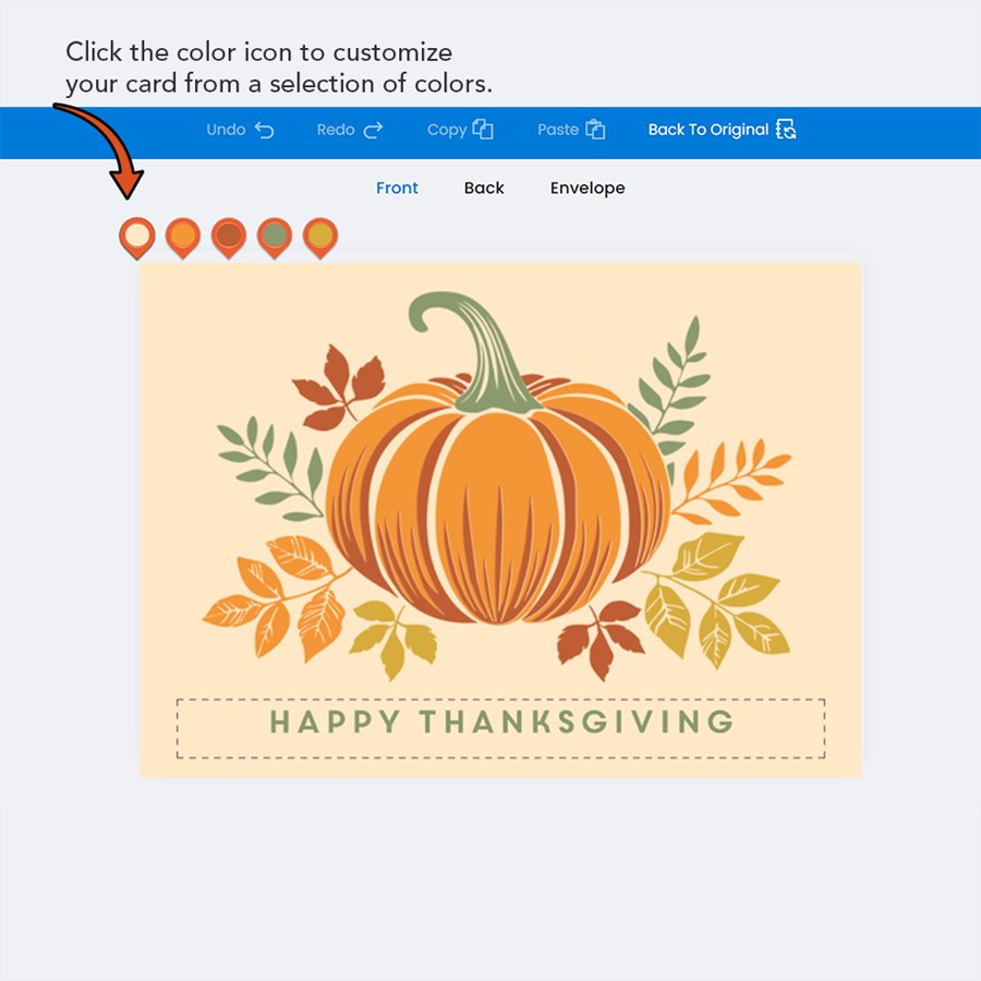 Celebrate the warmth of the season with the Perfect Pumpkin Thanksgiving Card, a beautifully illustrated design that captures the essence of autumn. Featuring a richly colored pumpkin centerpiece surrounded by fall foliage and delicate gold accents, this card sets a tone of gratitude and harvest charm. Ideal for sending personal or business thanks during the Thanksgiving season, this card offers space inside for your custom message. Add your free customization, like a name or company name, message, photo, logo, signatures, and more. Choose from different sizes, paper types, and envelopes with gummed or sanitary peel-and-seal closures. Want to have your personalized cards mailed to your recipients for you? Click 'Addressing + US Stamp + Mail' under the 'Addressing' tab when making your selections. All text is editable in addition to colors.