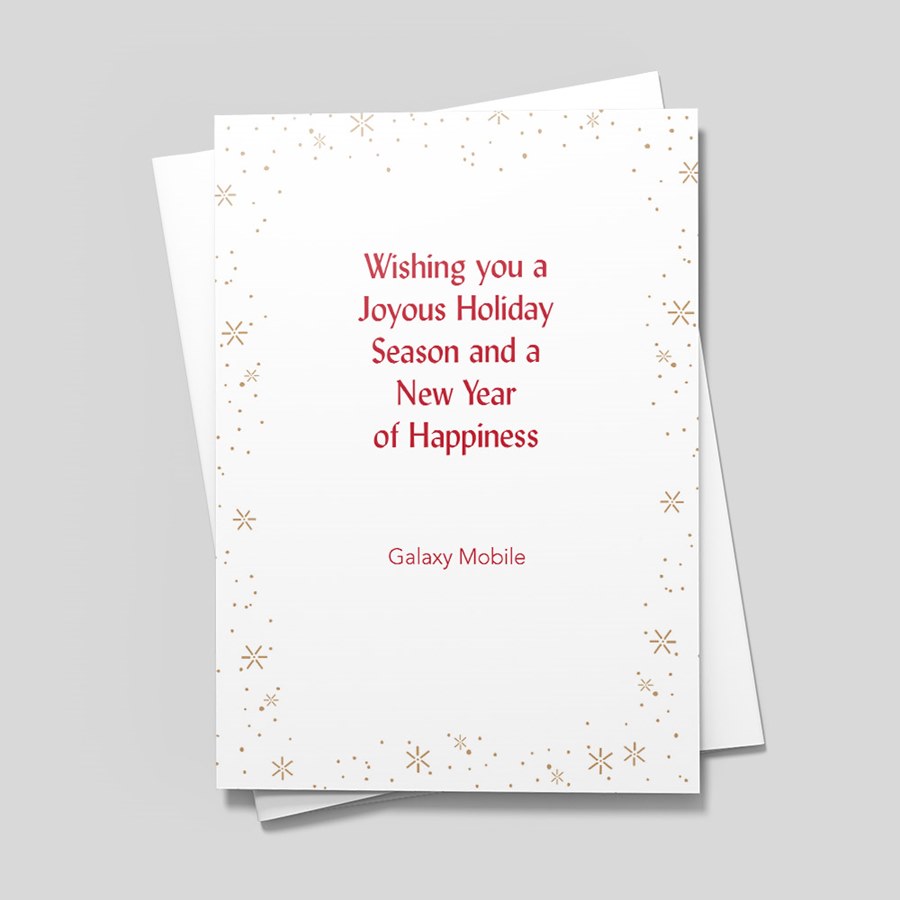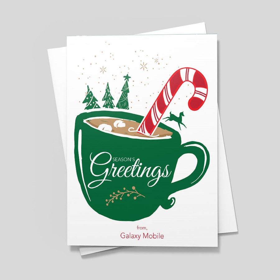 Bring warmth and charm to your holiday greetings with the Cocoa Cup Holiday Card. This cheerful design features an inviting cup of cocoa topped with marshmallows, nestled among festive holiday elements like candy canes and evergreen branches. With a soft color palette and cozy details, this card conveys a heartfelt seasonal message that's perfect for clients, coworkers, friends, or family. Add your free customization, like a name or company name, message, photo, logo, signatures, and more. Choose from different sizes, paper types, and envelopes with gummed or sanitary peel-and-seal closures. Want to have your personalized cards mailed to your recipients for you? Click "Addressing + US Stamp + Mail" under the "Addressing" tab when making your selections.