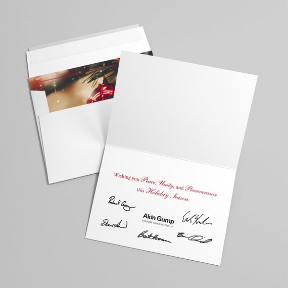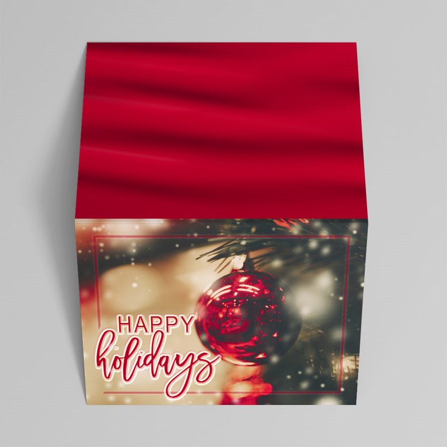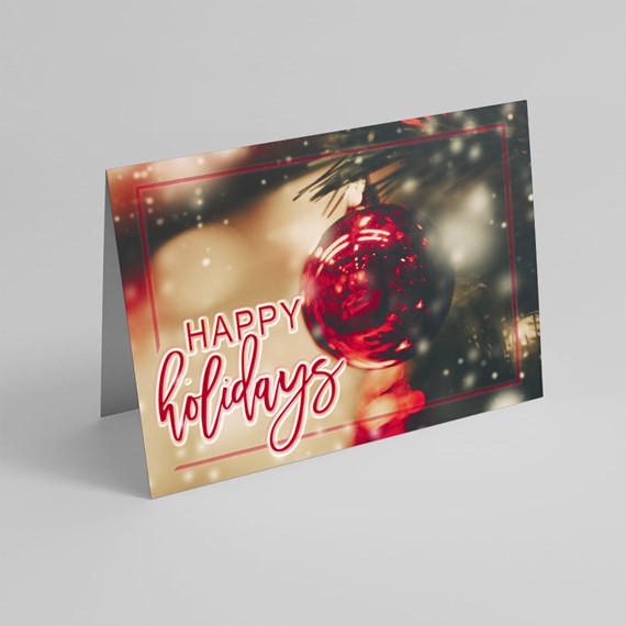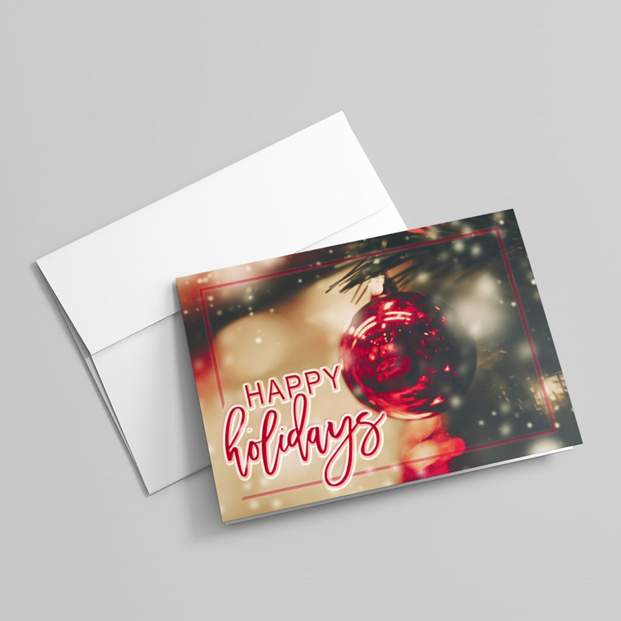 Cheerful red ornaments hang from a Christmas tree on the cover, creating a classic seasonal look that sets the tone for your message. Free personalization lets you tailor the greeting and names at no extra charge. Backed by our experience since 1998 and hands-on customer support, we pair thoughtful design with premium custom printing so your cards arrive looking polished and personal! Choose our full mailing service to streamline the process—we can handle mailing so your cards go straight to recipients without extra trips to the post office. If you need help customizing or mailing, our team is ready to guide you every step of the way.