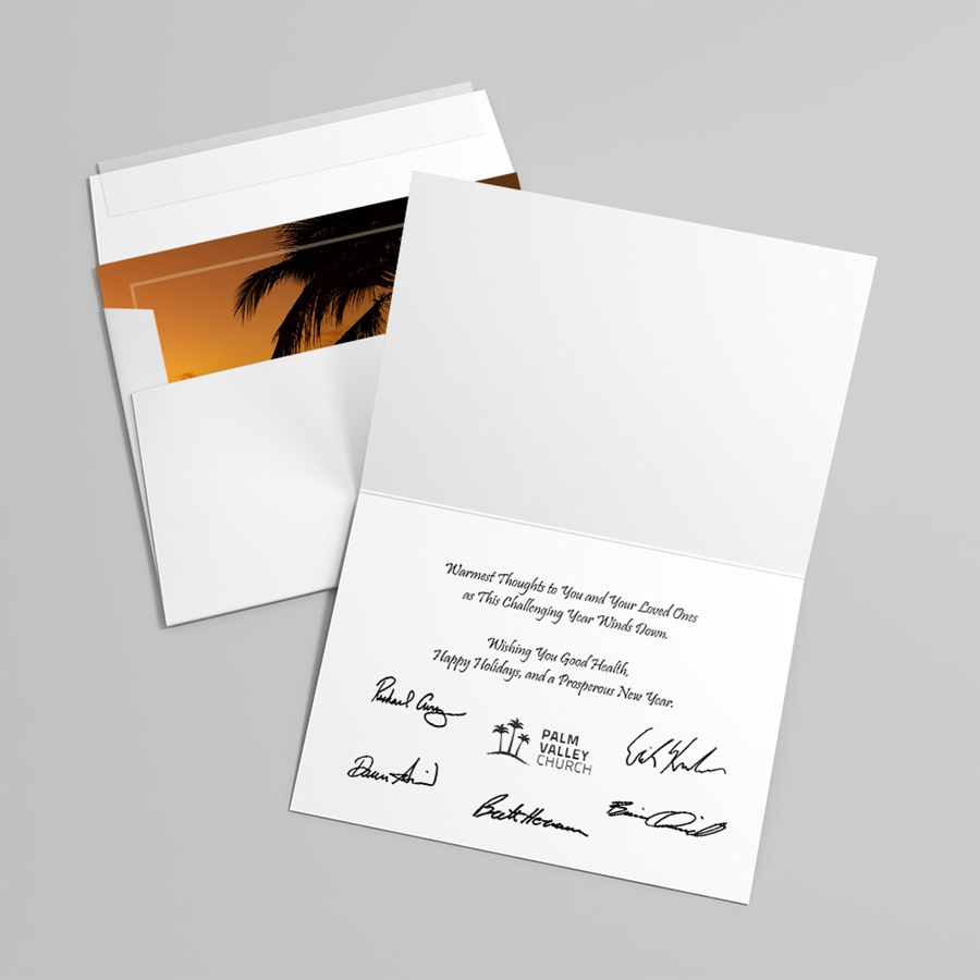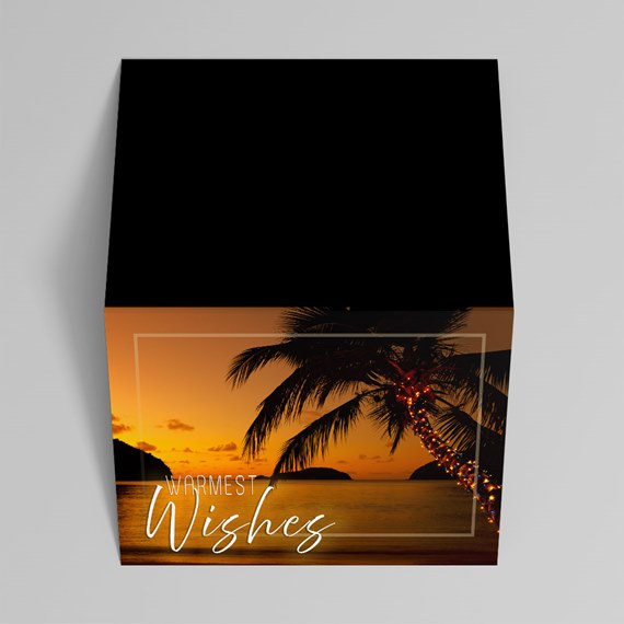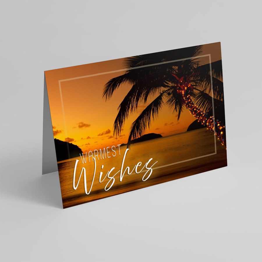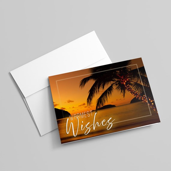 Tropical-themed holiday card with a sunset on the water near a palm tree decorated with white Christmas lights. A Warmest Wishes message is displayed at the bottom left in stylish white text. The card's interior is white, and the back is black. Choose from different paper types, sizes, and envelopes, then add your free personalization. Full mailing service offered.