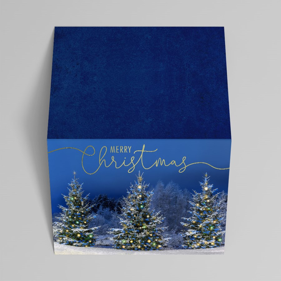 This custom holiday card features three Christmas trees with blue and white lights on a snowy path at night underneath a Merry Christmas message in stylish gold text. The card's interior is white, and the back is midnight blue.