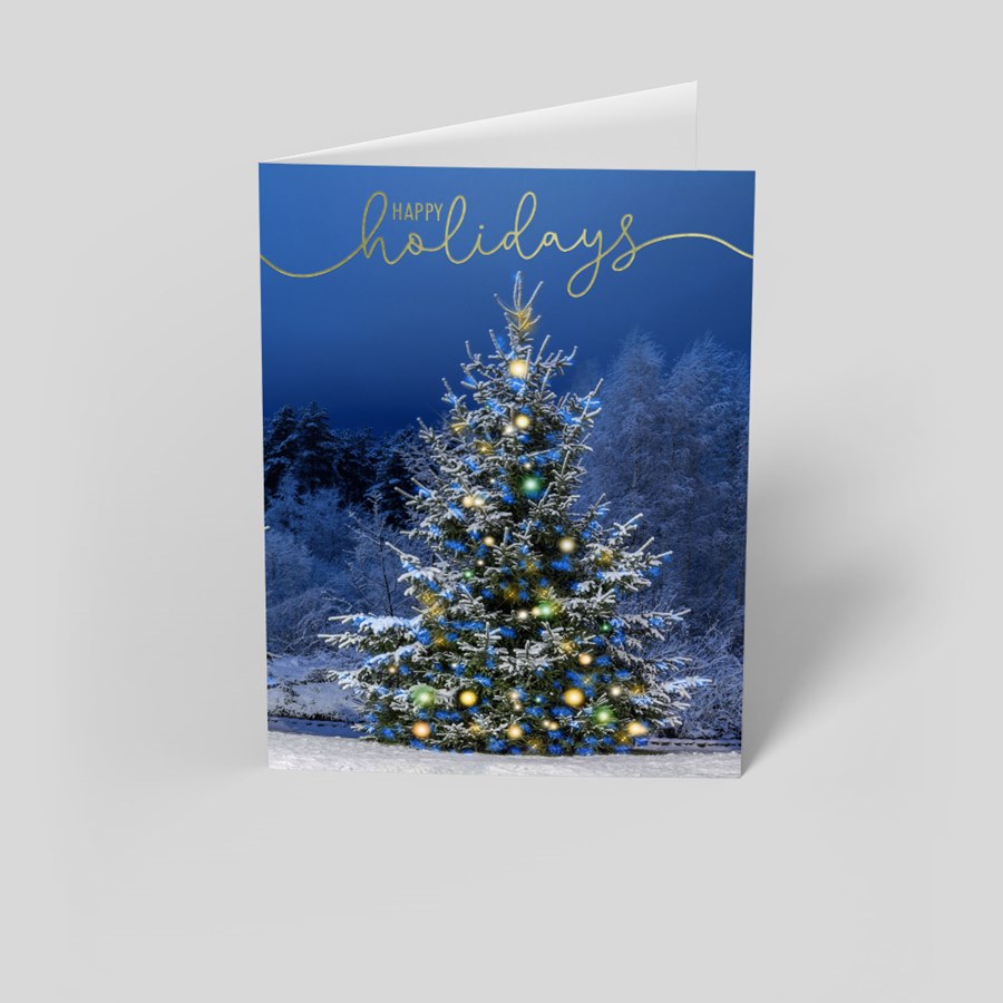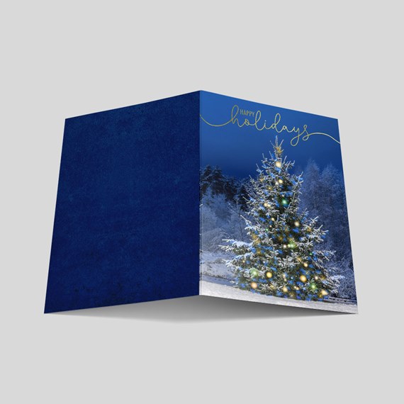 This custom holiday card features a Christmas tree with blue and white lights on a snowy path at night underneath a Happy Holidays message in stylish gold text. The card's interior is white, and the back is midnight blue.