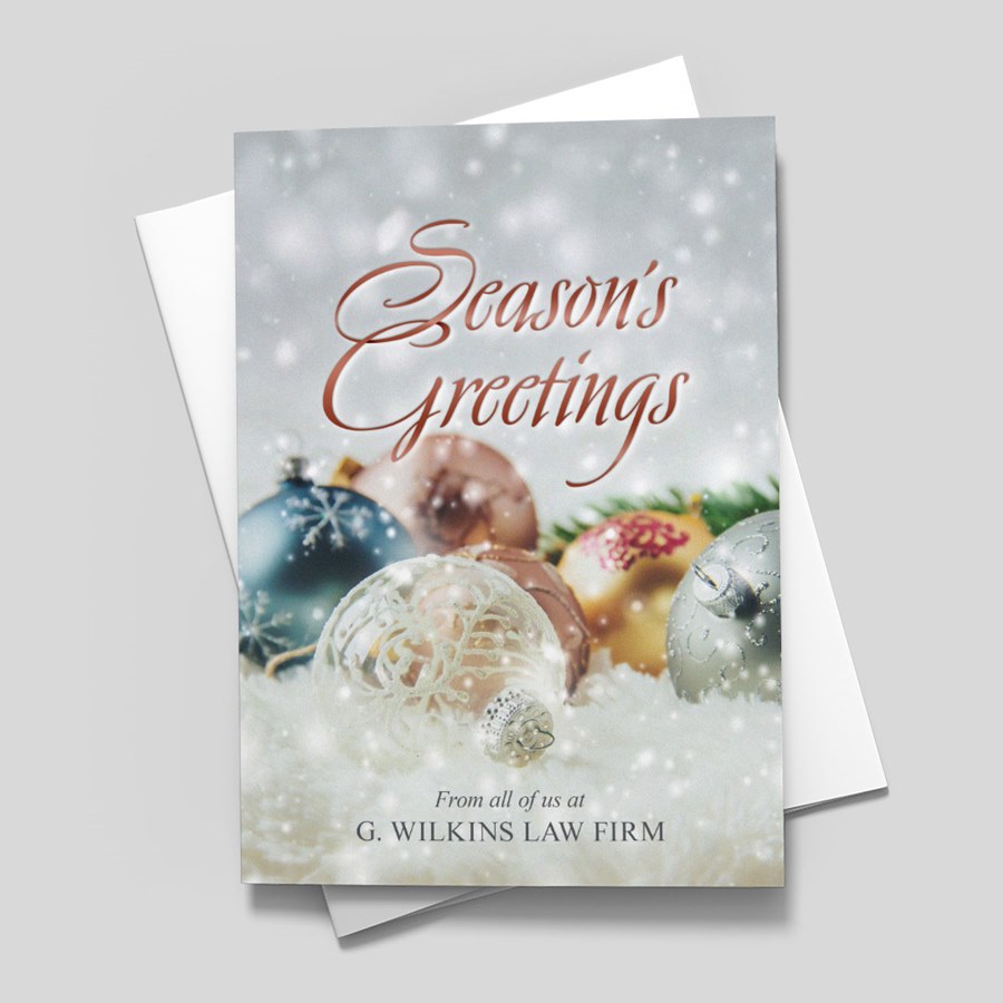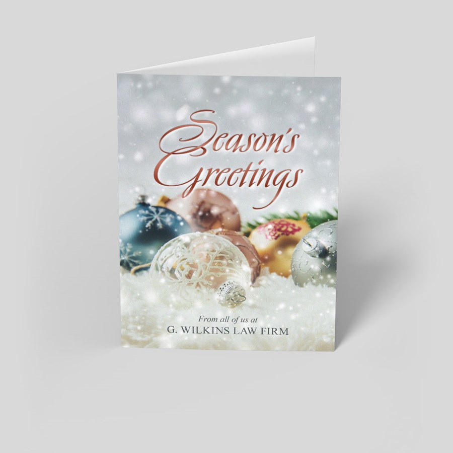 This custom holiday card features an assortment of colorful Christmas ornaments on a snowy background with a white bokeh pattern. "Season's Greetings" is diapled at the top in a stylish copper script.