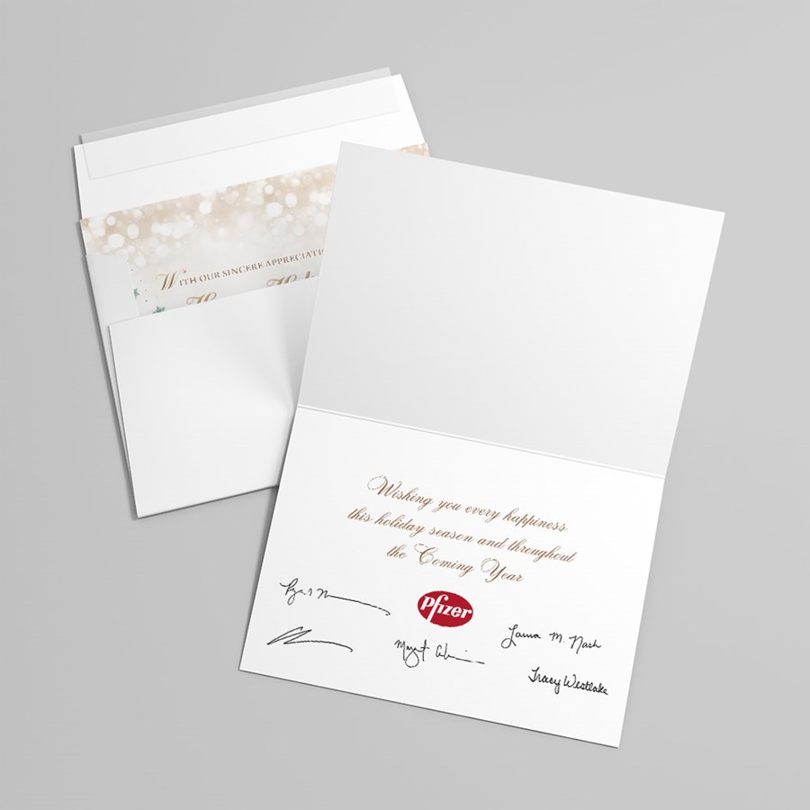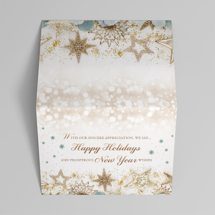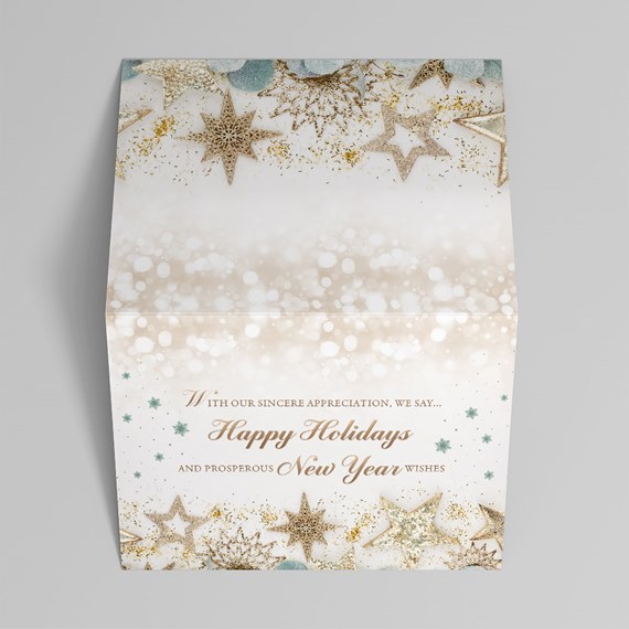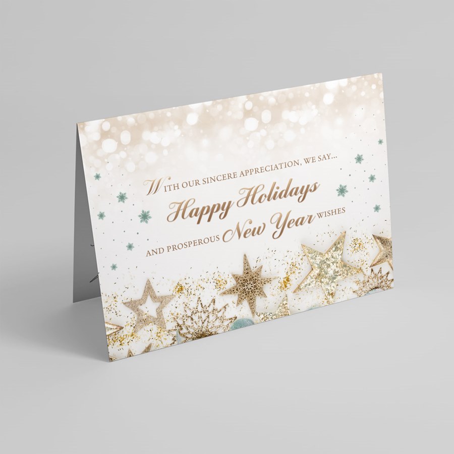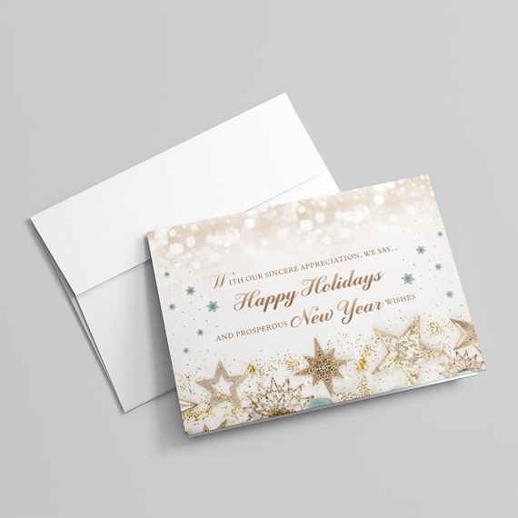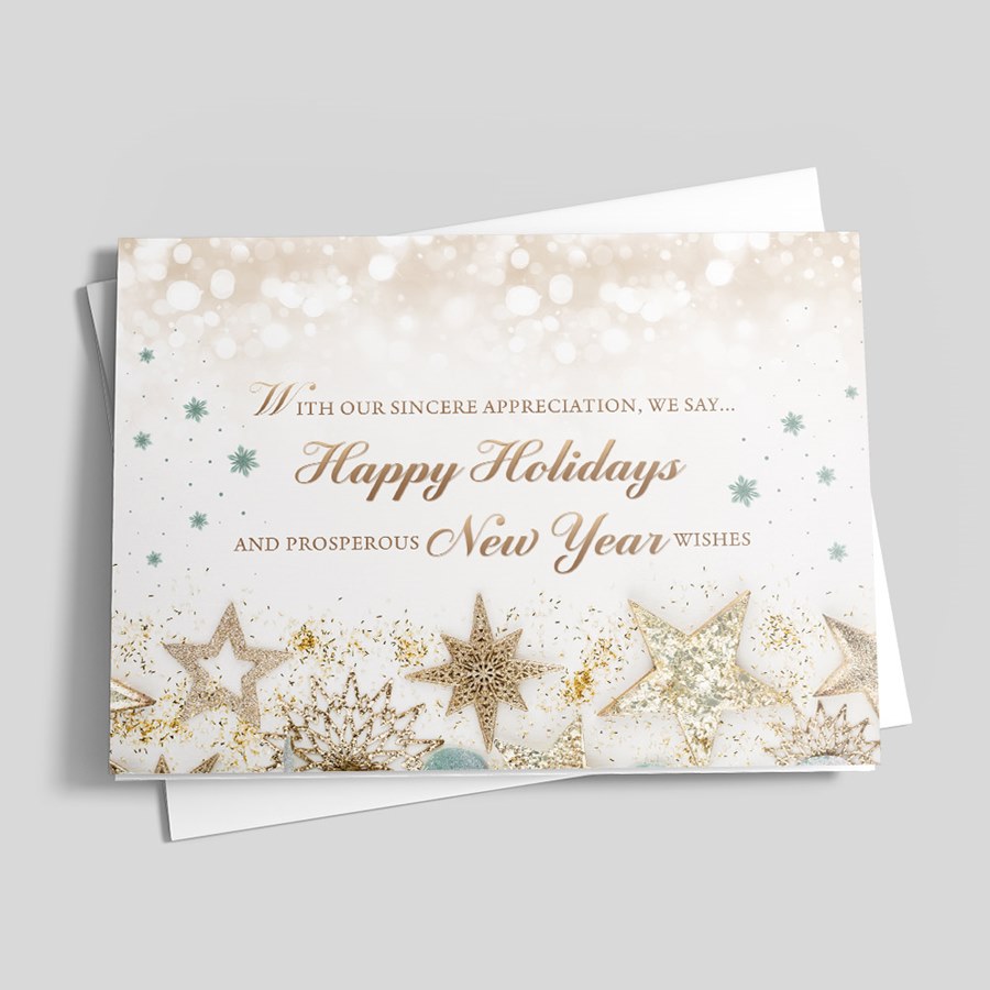 This custom holiday card features a soft gold bokeh background with gold and sage green stars and ornaments. The words "With Our Sincere Appreciation, We Say...Happy Holidays and Prosperous New Year Wishes" are displayed in stylish gold letters.
