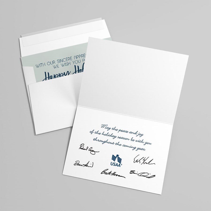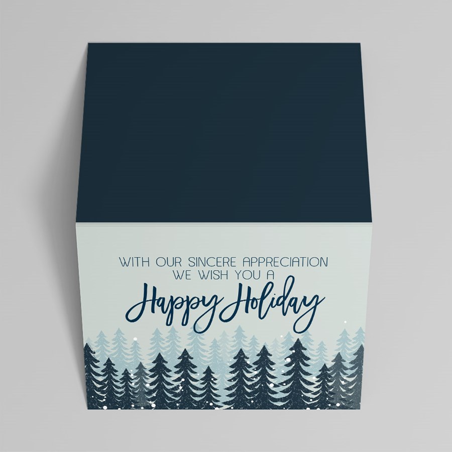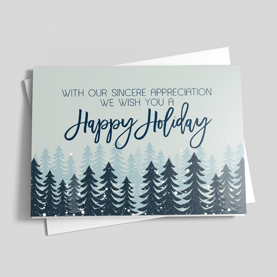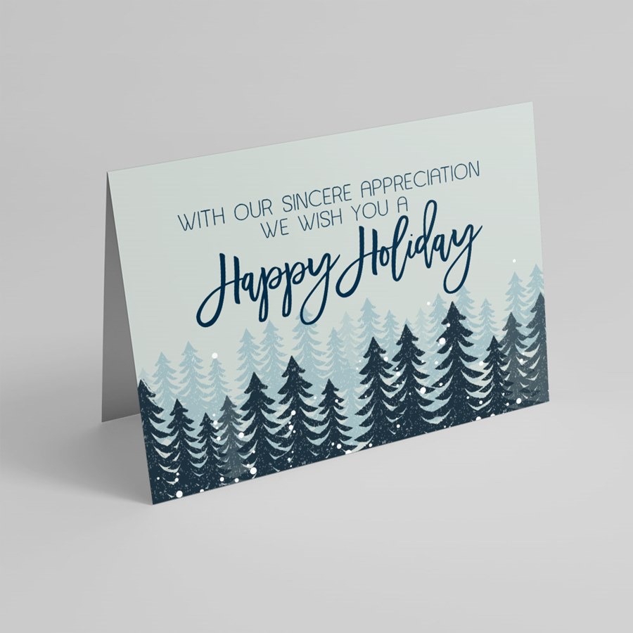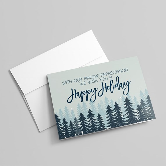 This custom holiday card features a pine forest underneath a message that reads, 'With Our Sincere Appreciation We Wish You A Happy Holidays' in a matching shade of green. The card's interior is white, and the back is dark teal.