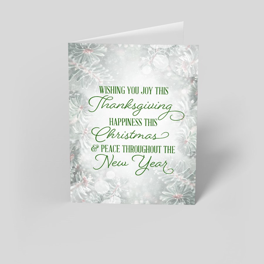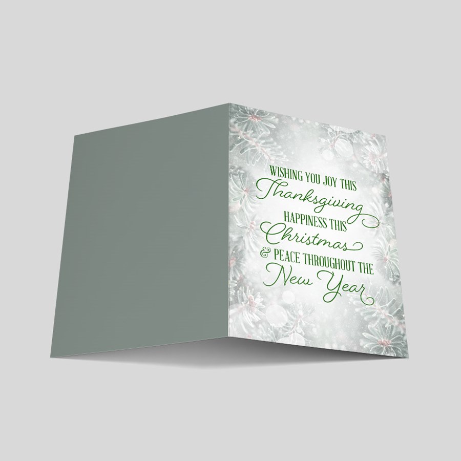 This custom holiday card features a snowy pine border around a message that reads, 'Wishing You Joy This Thanksgiving, Happiness This Christmas, & Peace Throughout The New Year' in stylish green text. The card's interior is white, and the back is a muted gray sage. Add your free personalization.