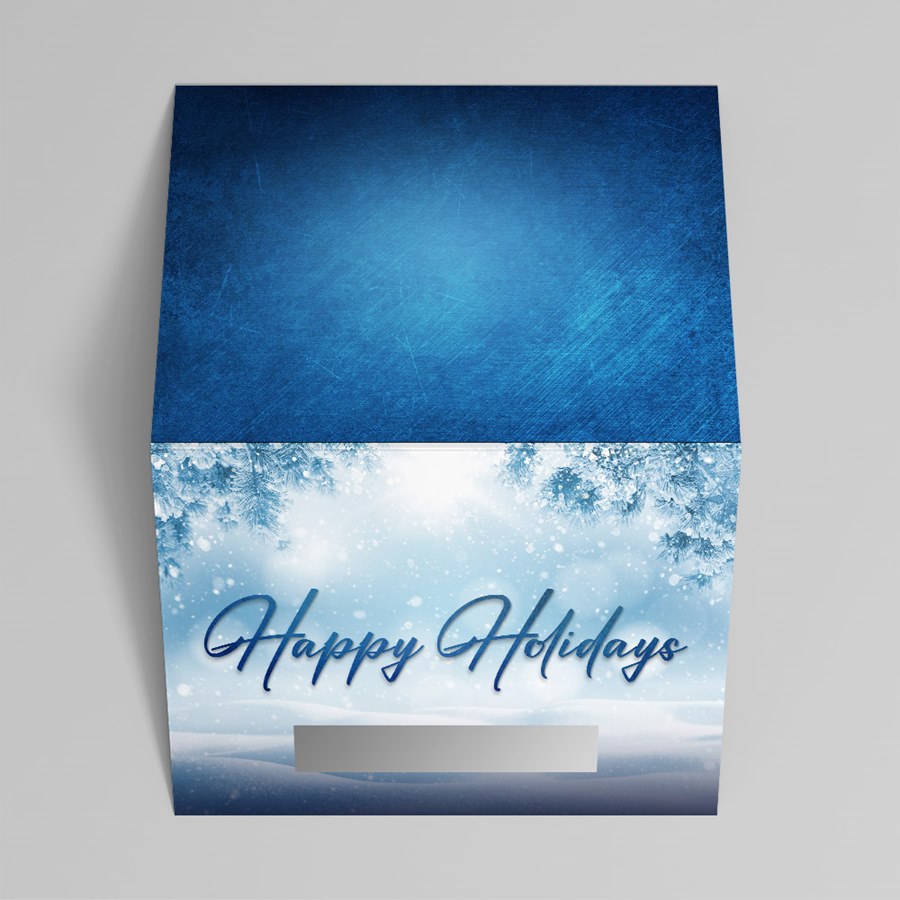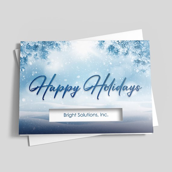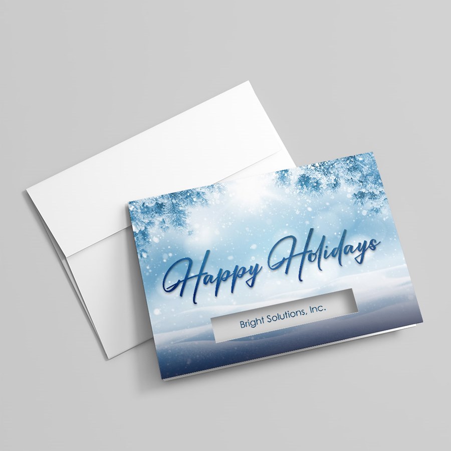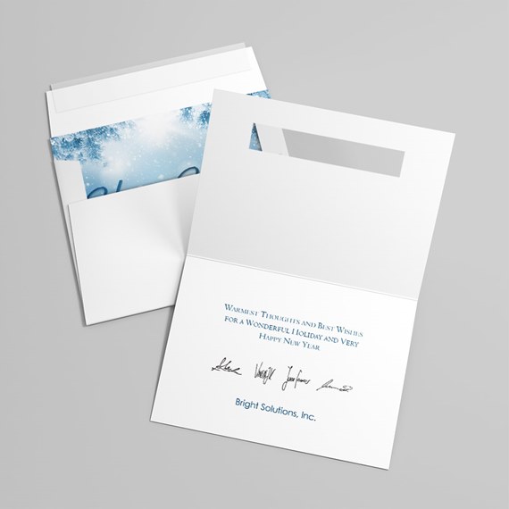 Send a quiet winter moment with every greeting.- Elegant seasonal design: cool blue tones, gentle snowfall and tasteful pine accents across the top create a serene holiday scene that complements any message.