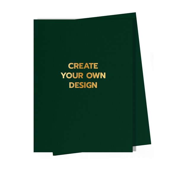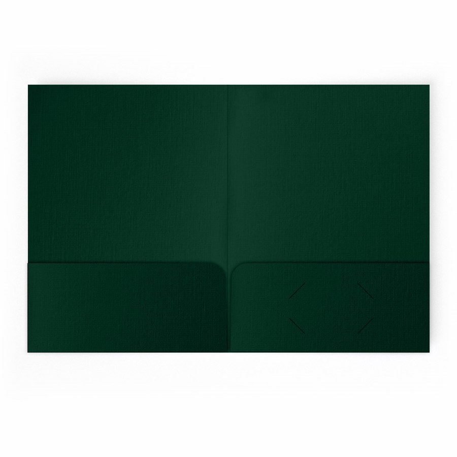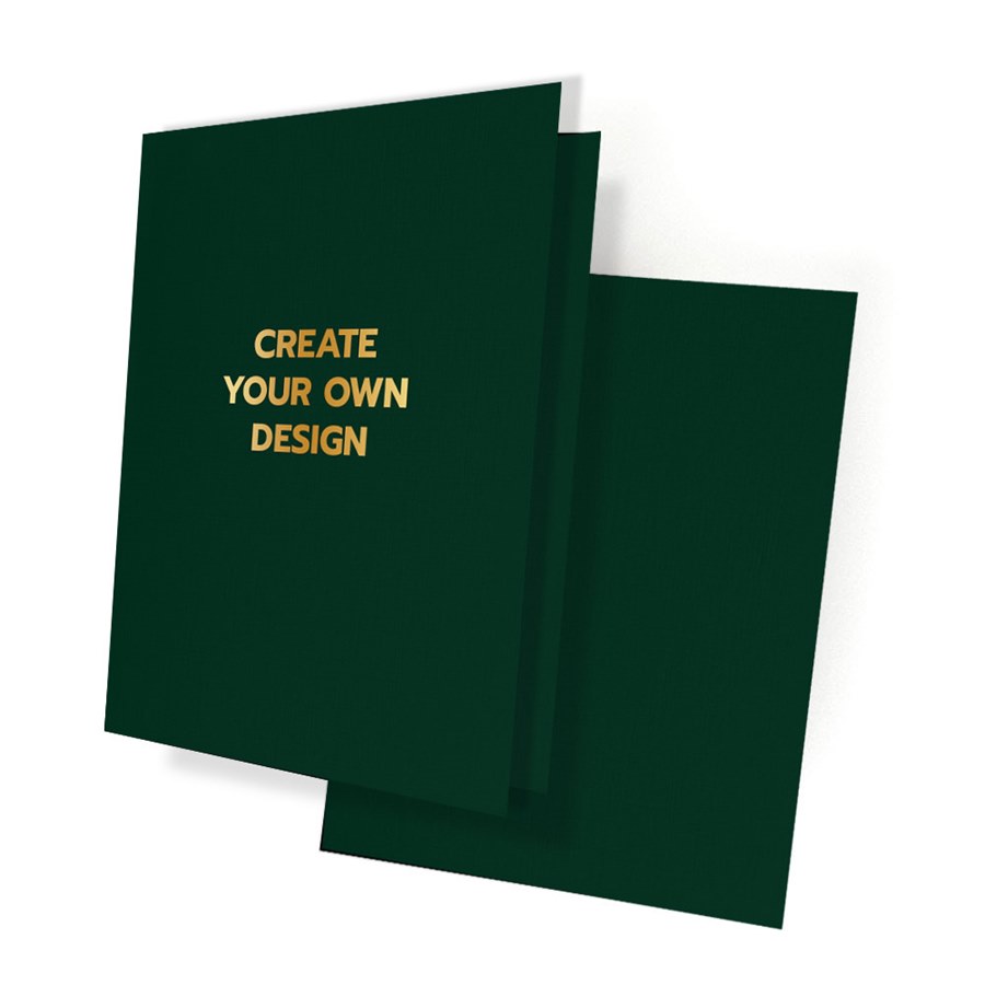 This 9” x 12” standard size presentation folder will be printed on Emerald Green Classic 80# Linen stock with your choice of one foil color printed on the front side only. You can upload your artwork or add text in our studio. These folders will help to keep your business looking professional and organized at meetings and sales presentations. We have quantities as low as 50 to accommodate small to large budgets and projects. With the folder open, you will see two inside pockets with slits on the right side to easily insert your business card.
