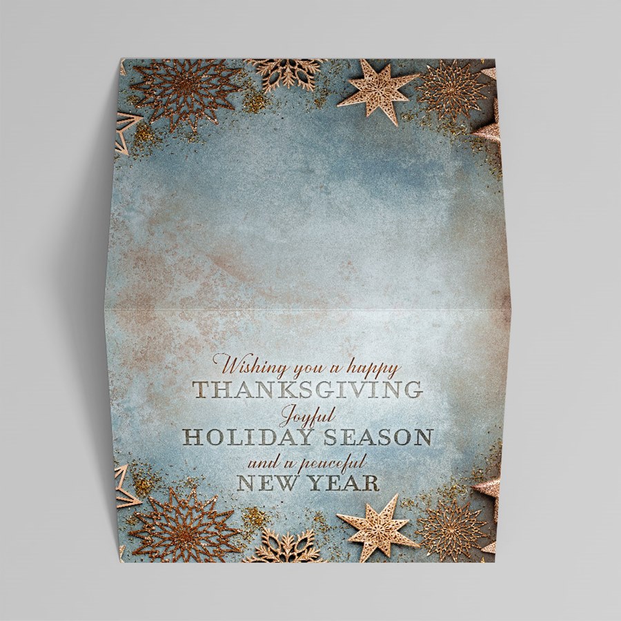 This print-on-demand holiday card showcases a tasteful gold-tone trio motif and is fully customizable—add your logo, tailor the greeting, and adjust accent colors to match your brand. Designed for affordable, fast production, it helps small businesses and entrepreneurs send a polished, on-brand seasonal message without large minimums or long lead times. Ideal for client thank-you notes, direct-mail promotions, event invitations, staff appreciation, or retail handouts, this card works for single greetings or campaign-sized runs. Its versatility and quick turnaround make seasonal outreach simple and practical for busy teams looking to stay top of mind.Common Customer Questions