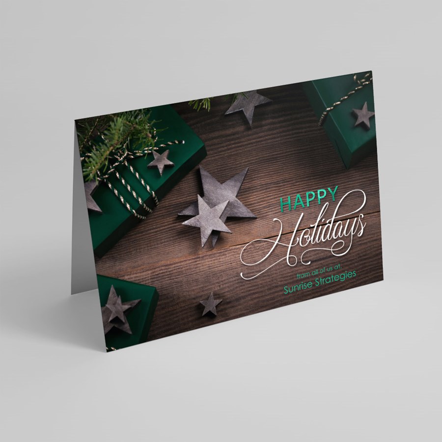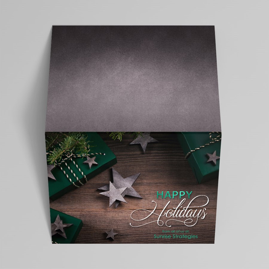 - Rustic, festive look: Dark wood-grain background with green wrapped gifts, gray wooden star ornaments, braided twine and a fresh pine sprig framed by elegant script typography that reads "Happy Holidays."