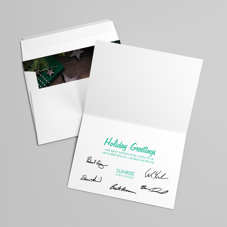 - Polished interior options: Images show a teal "Holiday Greetings" heading and a printed message with multiple signatures—ideal when you want consistency across mailings.
