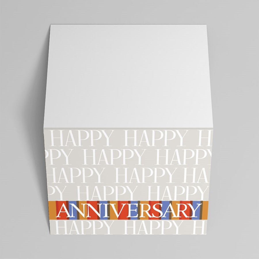 - Bold ANNIVERSARY headline sits on a horizontal band of color blocks—red, orange, blue and yellow—giving a clear celebratory focal point.